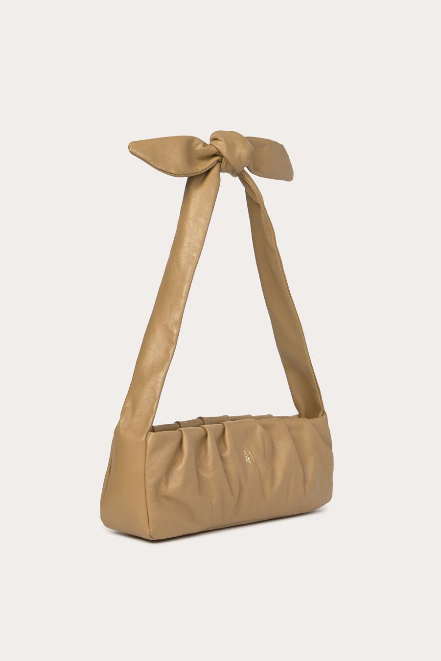 Soft Napa leather, baguette-styled, ruched, with tie strap detailed shoulder bag.