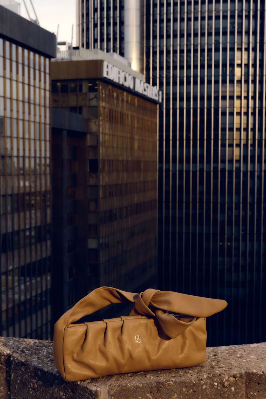 Yumuşak Napa deri, baget görünümlü, büzgülü, bağlamalı askı detaylı omuz çantası.