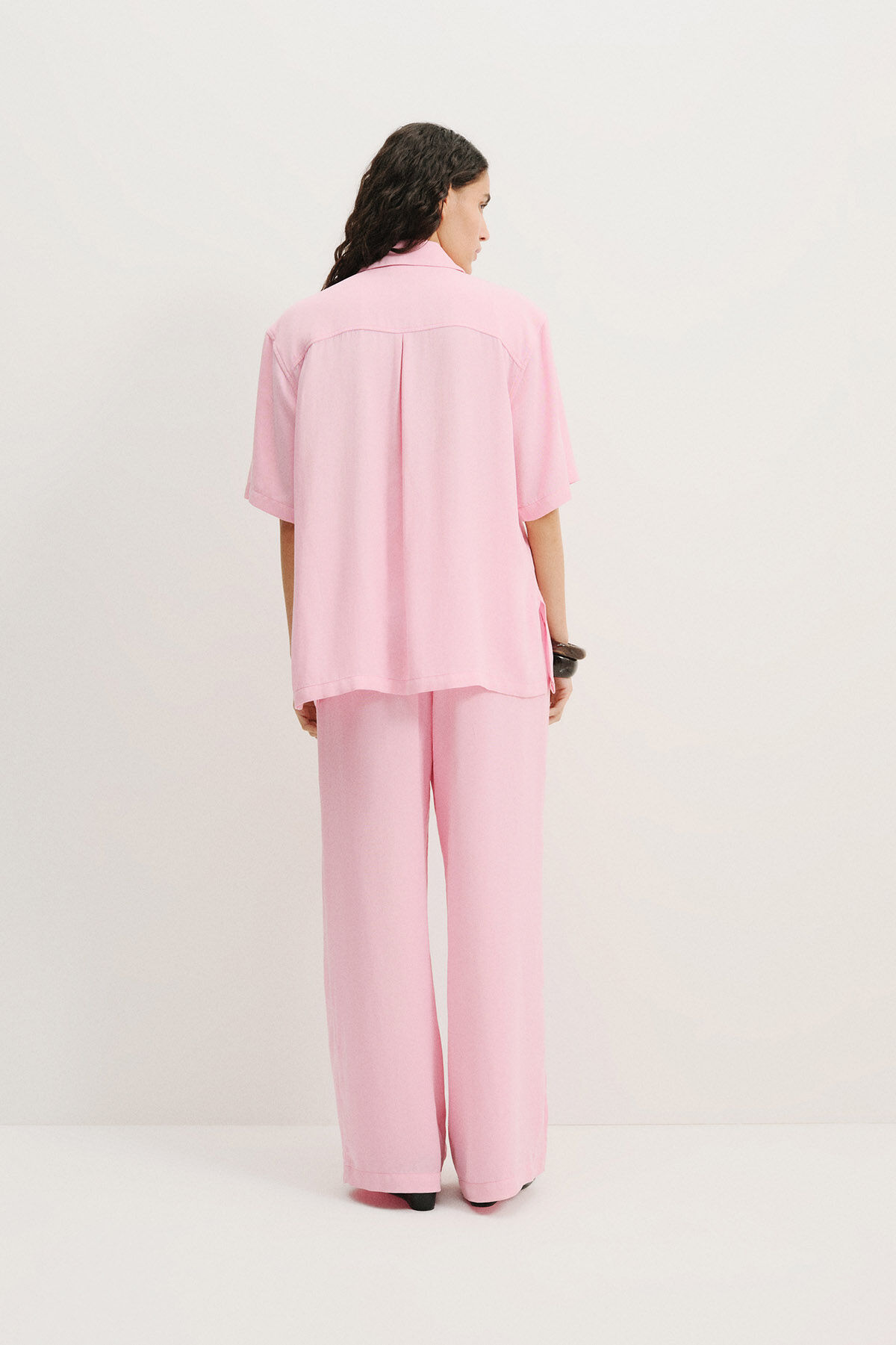 Modern ve rahat stilin buluştuğu bu açık pembe gömlek, kısa kollu ve geniş kesimiyle sıcak havalarda ferah bir kullanım sunar. Punto dikiş detaylarıyla öne çıkan tasarım, geniş yakası ve önden cep detayıyla hem şık hem de fonksiyonel bir görünüm sağlar. Yan yırtmaçlar hareket özgürlüğü sunarken tencel kumaşı ile hafiflik ve nefes alabilirlik sağlar. Günlük şıklığı zahmetsizce yakalamak isteyenler için ideal bir tercihtir.