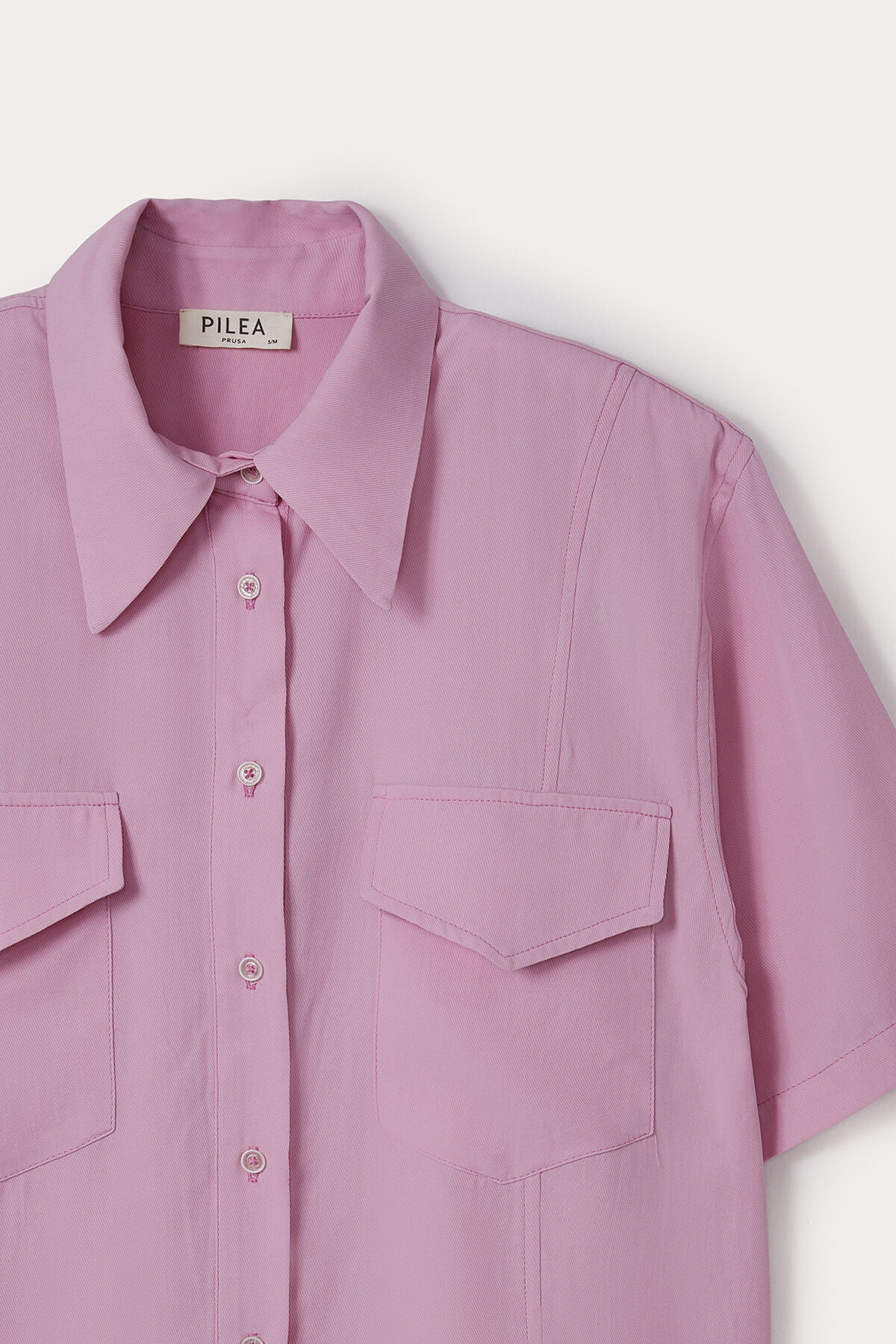 Gelince Haber VerAçık pembe kısa kollu punto dikişli geniş yaka önden cepli yandan yırtmaçlı geniş kesim gömlek.