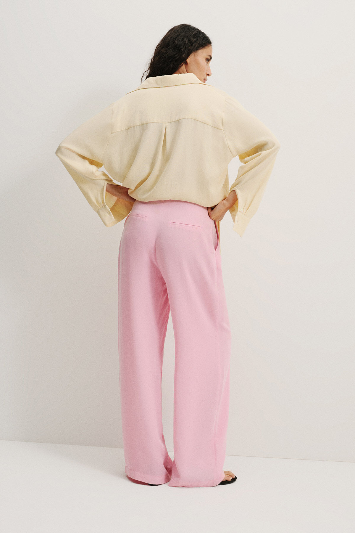 Gelince Haber VerAçık pembe tencel kumaş önden pili detaylı bel kemerli cepli geniş kesim palazzo pantolon.