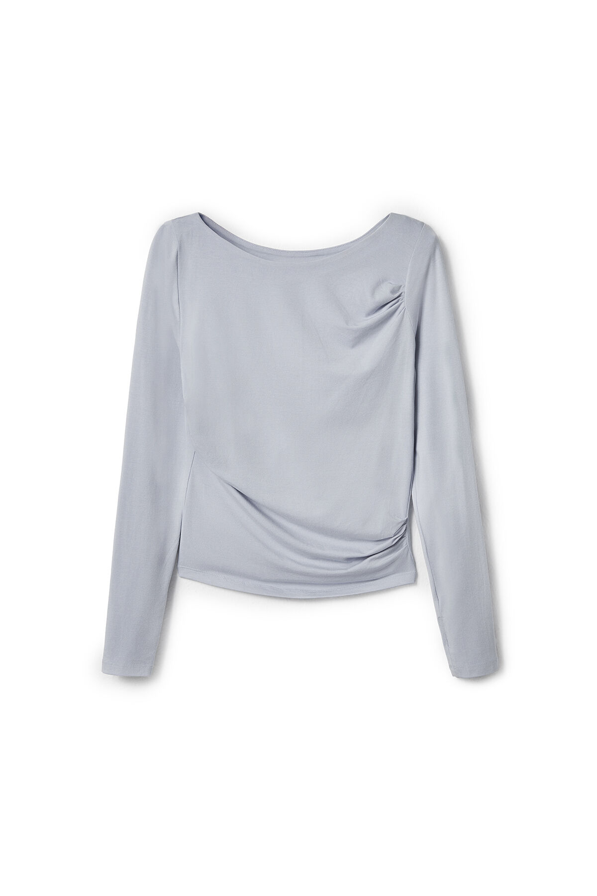 Notify me when its in stockLight blue boat neck fitted blouse with long sleeves and side ruching in stretch modal fabric