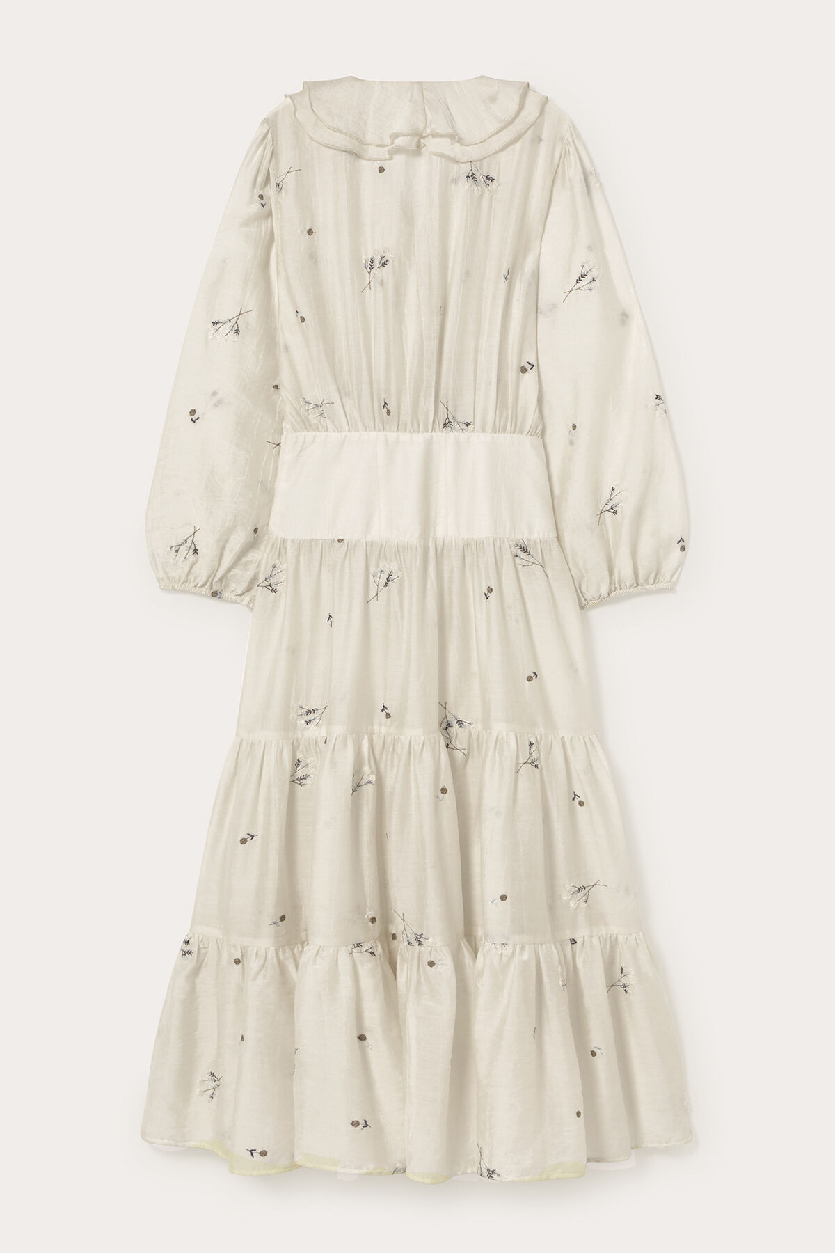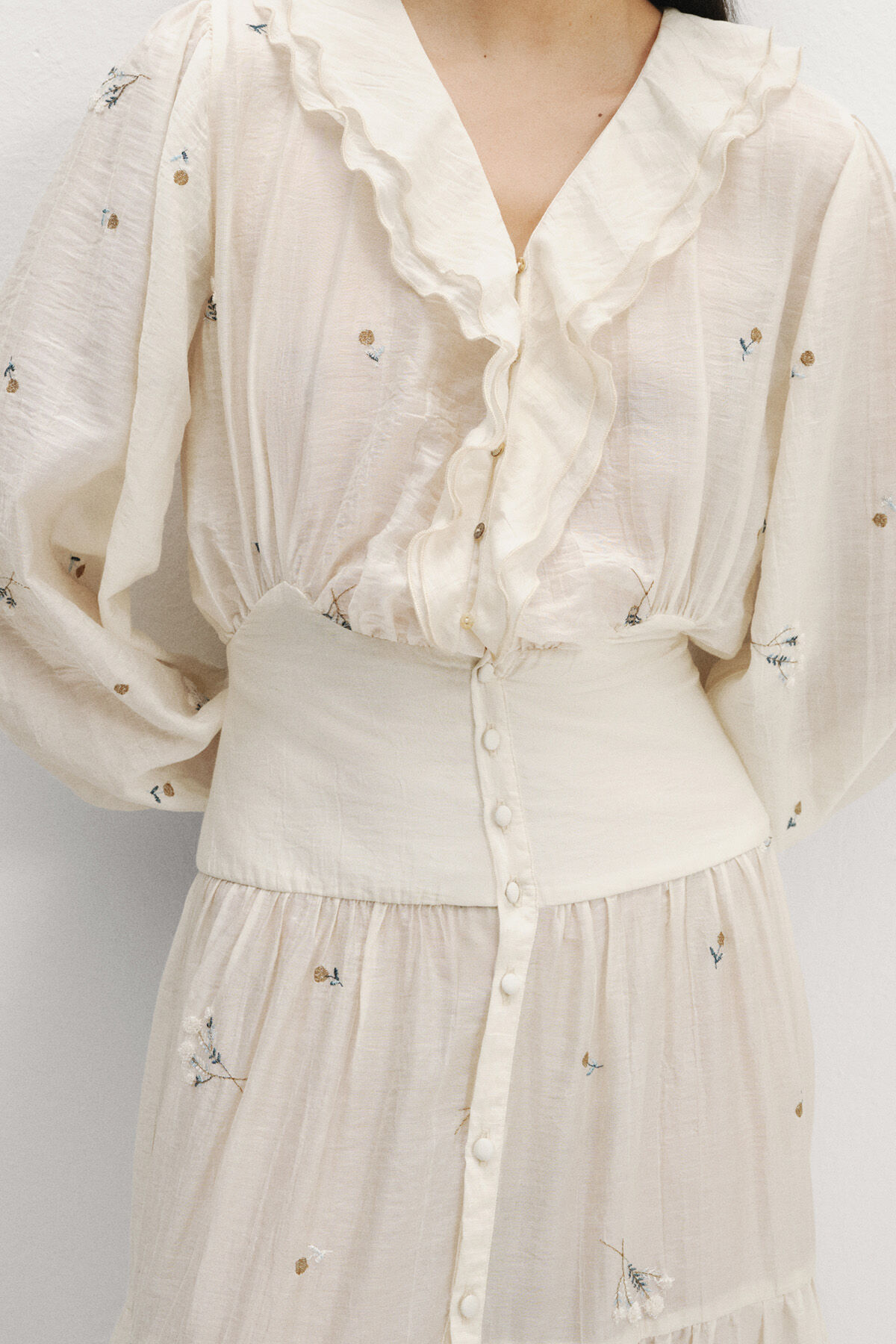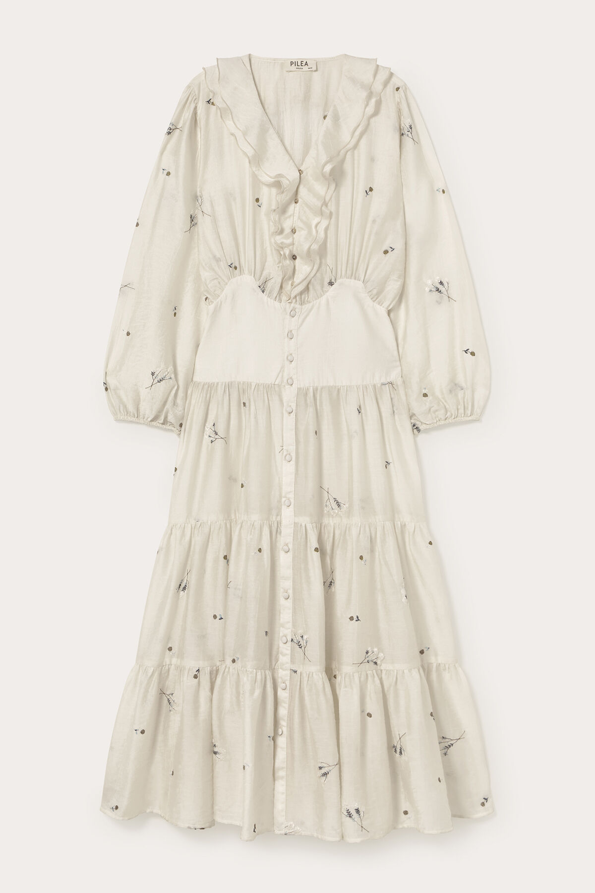 Gelince Haber VerEkru zemin üzerine mavi çiçek nakışlı, beli korseli, V yaka, önden düğmeli, yakası volan detaylı, geniş kollu, manşetleri büzgülü, portatif astarlı, eteği katlı maksi boy, tencel kumaş kadın elbise.