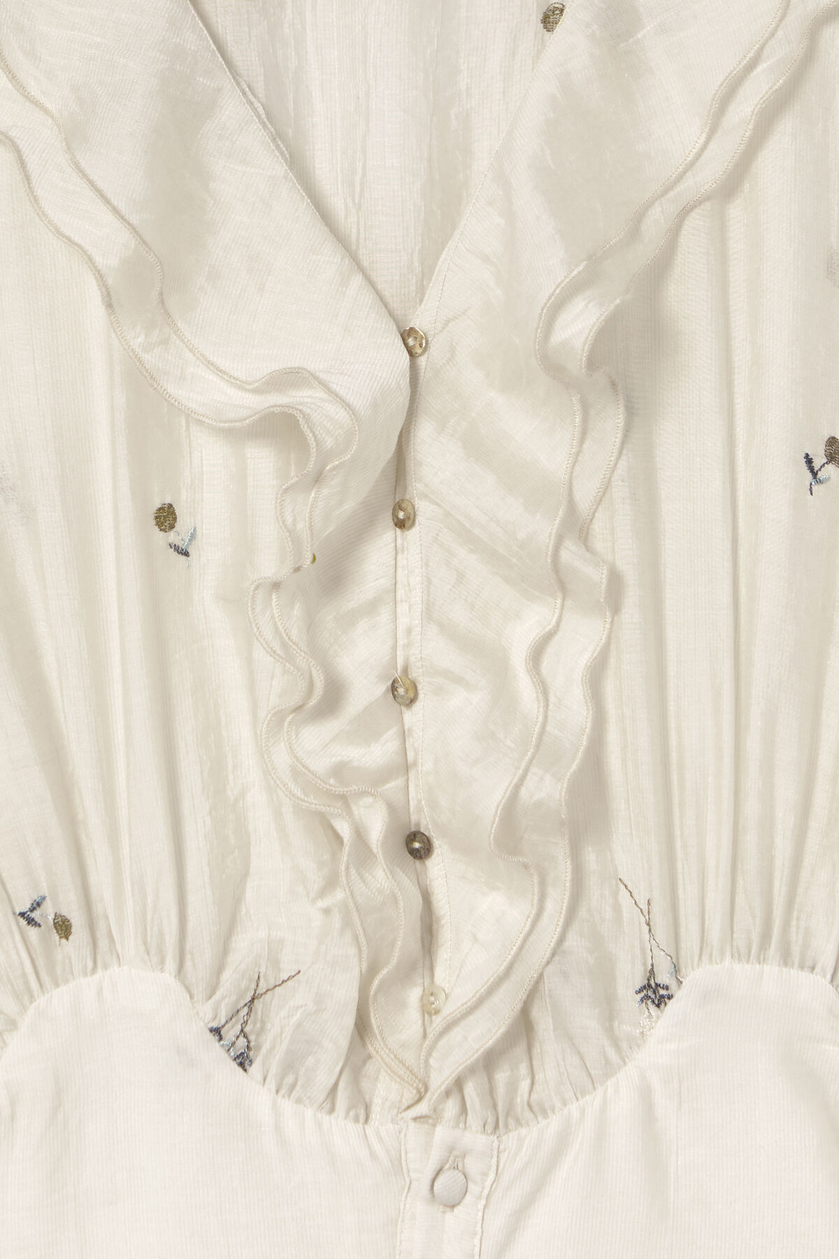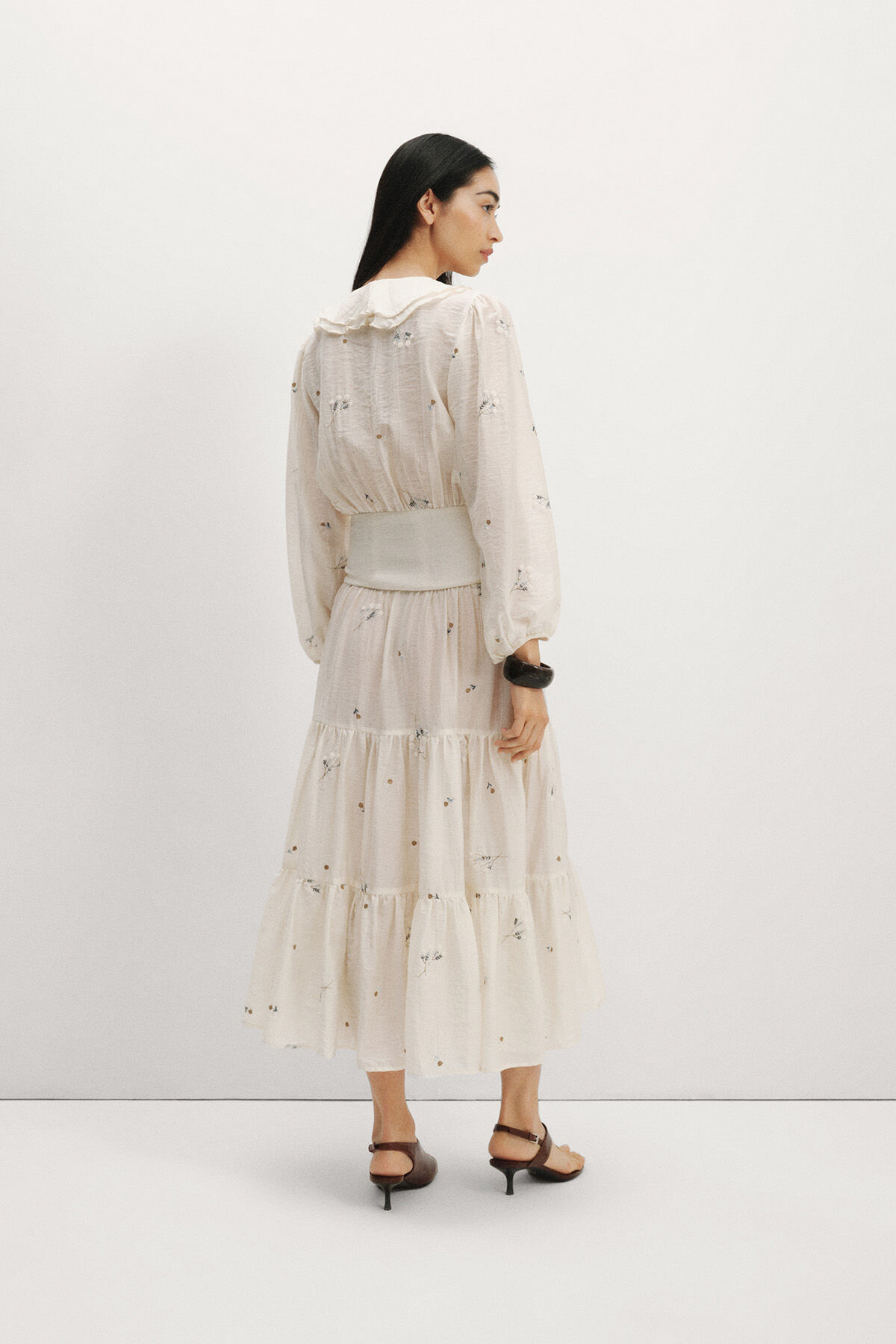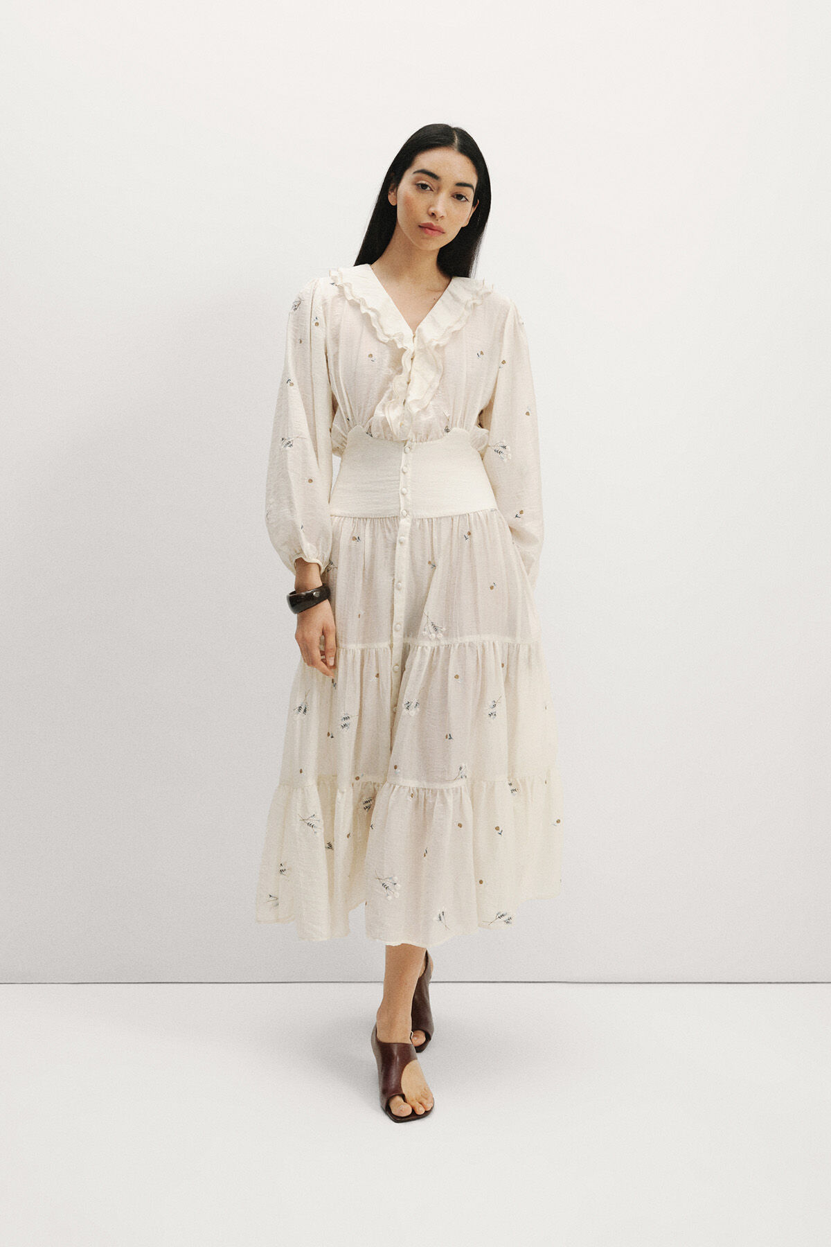 Gelince Haber VerEkru zemin üzerine mavi çiçek nakışlı, beli korseli, V yaka, önden düğmeli, yakası volan detaylı, geniş kollu, manşetleri büzgülü, portatif astarlı, eteği katlı maksi boy, tencel kumaş kadın elbise.