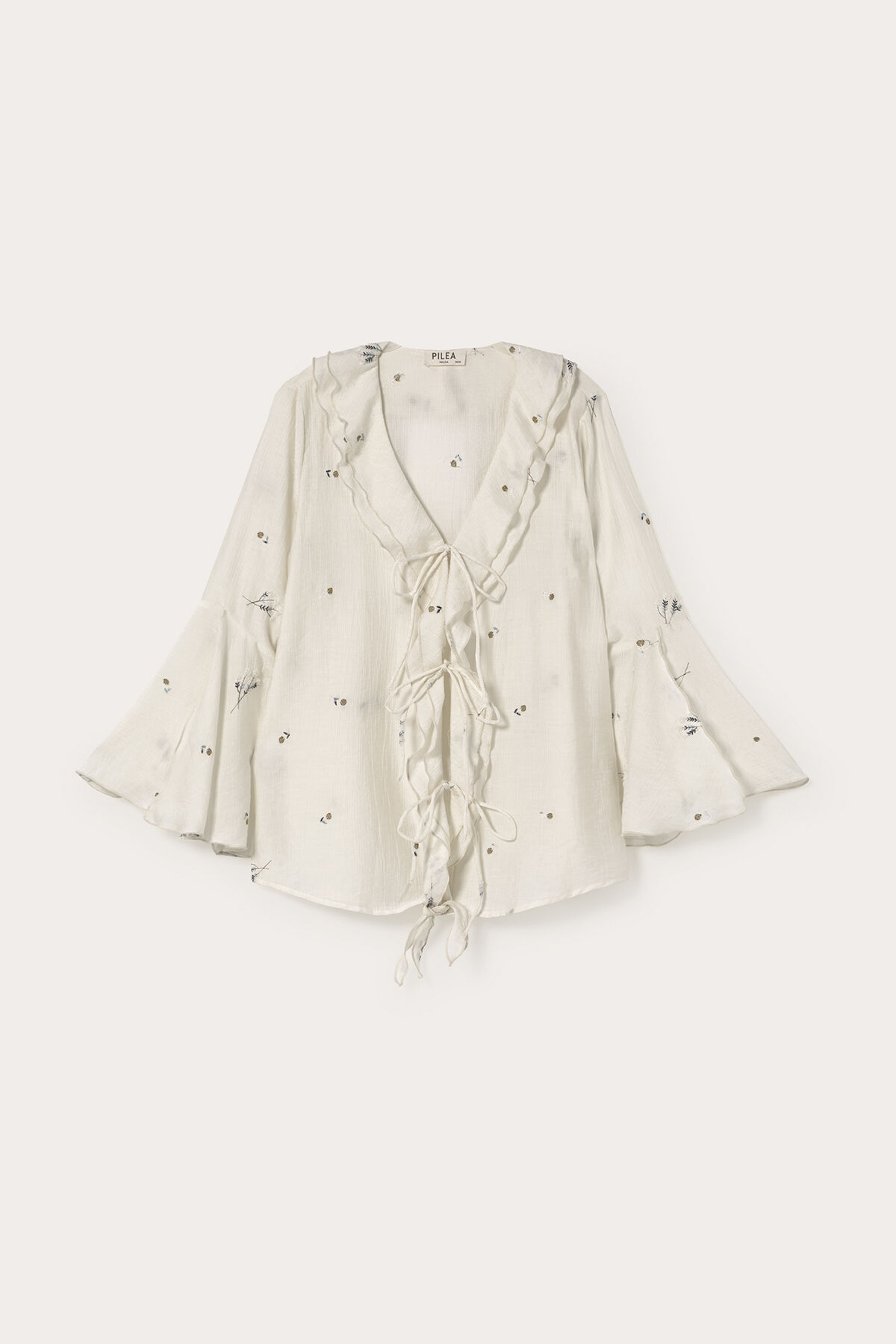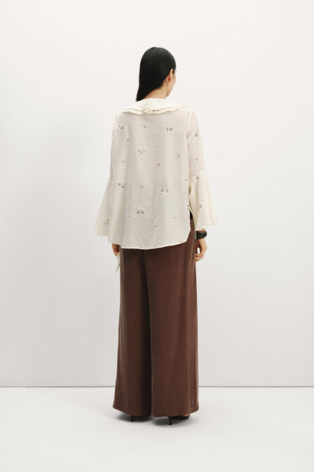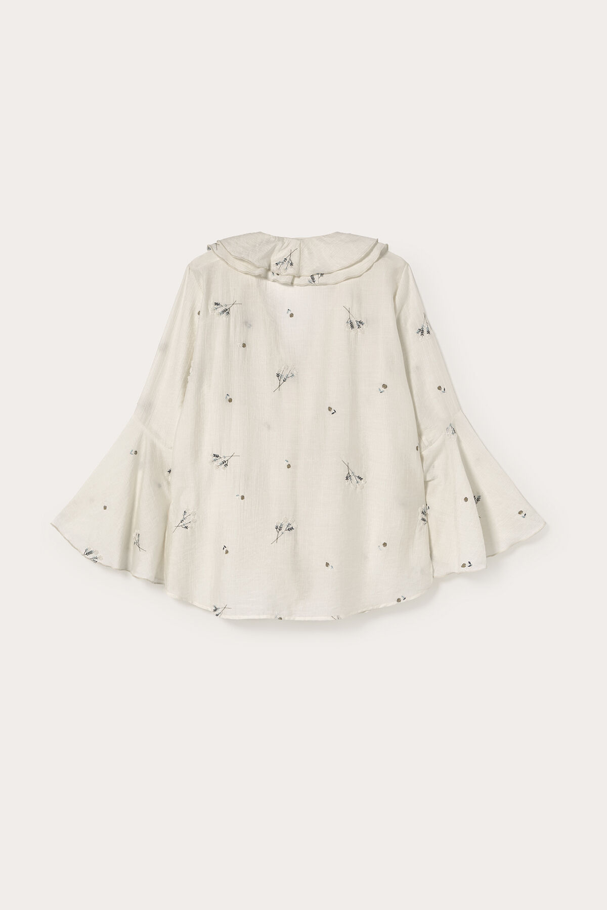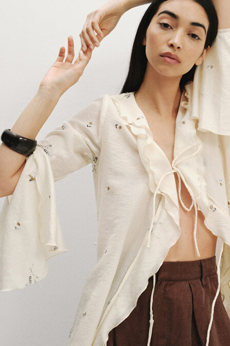 Gelince Haber VerEkru rengi mavi çiçek nakış detaylı kolları ve yakası volanlı önden bağlamalı geniş kesim tencel kumaş gömlek bluz.