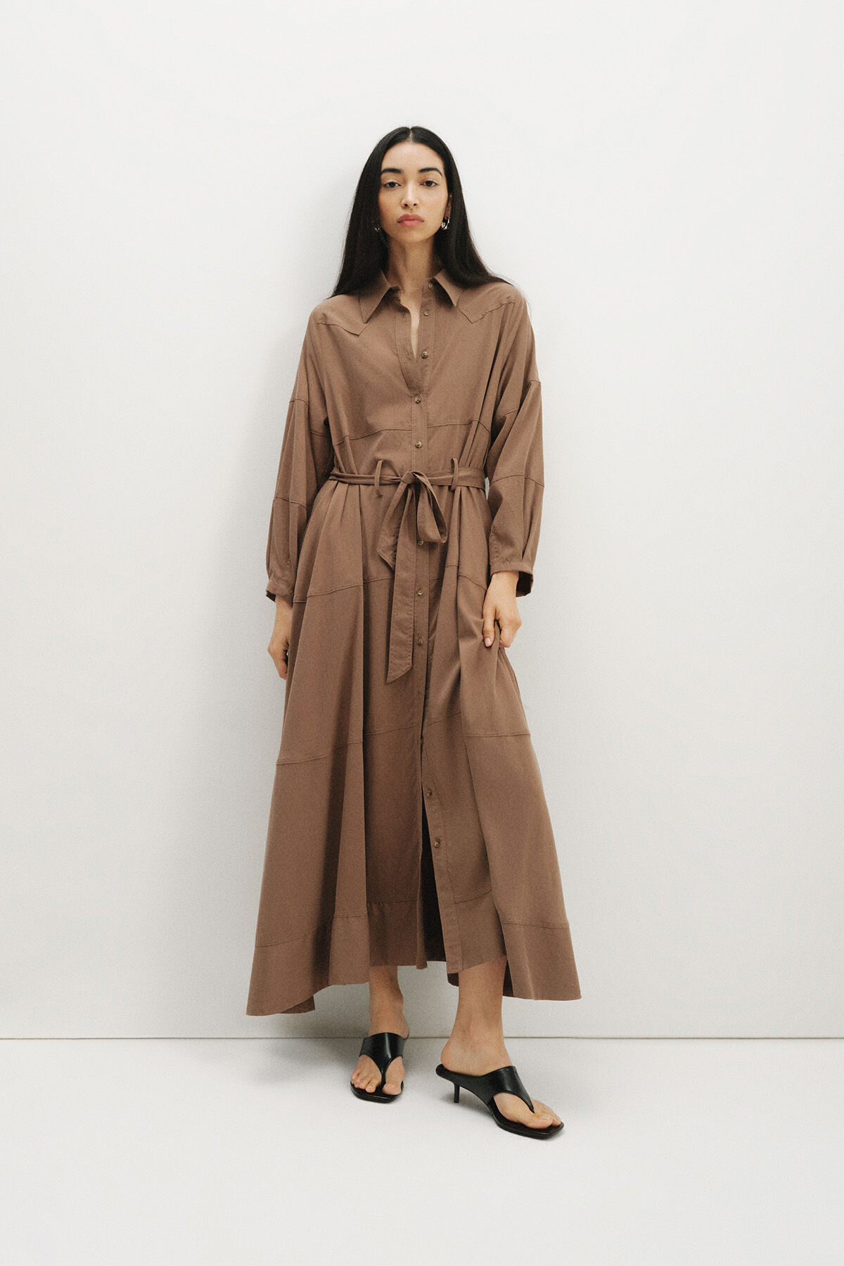 Notify me when its in stockBrown Long Sleeve, Tiered Stitch Detailed, Button-Front, Belted Waist, Asymmetric Hem Modal Blend Maxi Dress