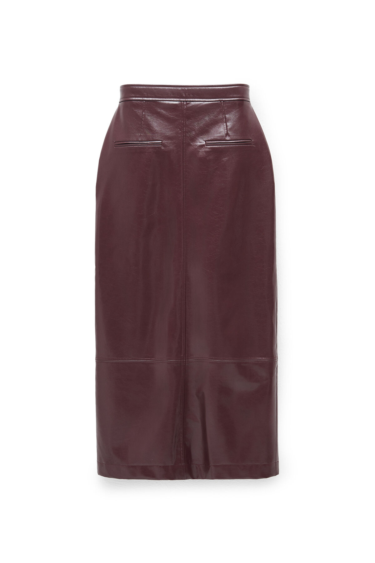 Notify me when its in stockBurgundy slim-fit long faux leather skirt with front zipper closure, cargo pockets, front slit, and tone-on-tone stitching