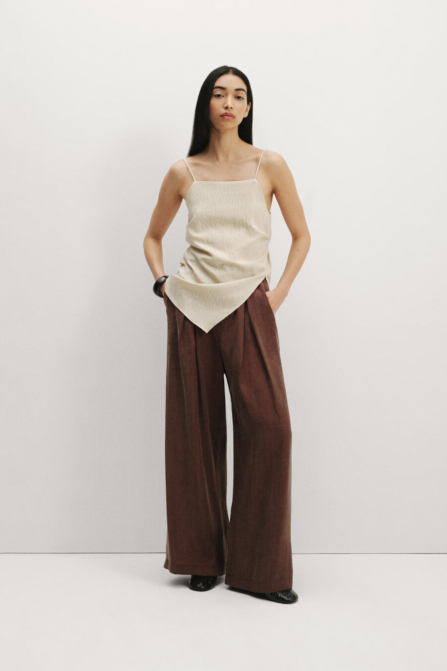 Gelince Haber VerKrem üzeri siyah çizgili ip askılı yanları büzgü detaylı arkadan bağlamalı asimetrik kesim modal karışımlı kumaştan bluz.