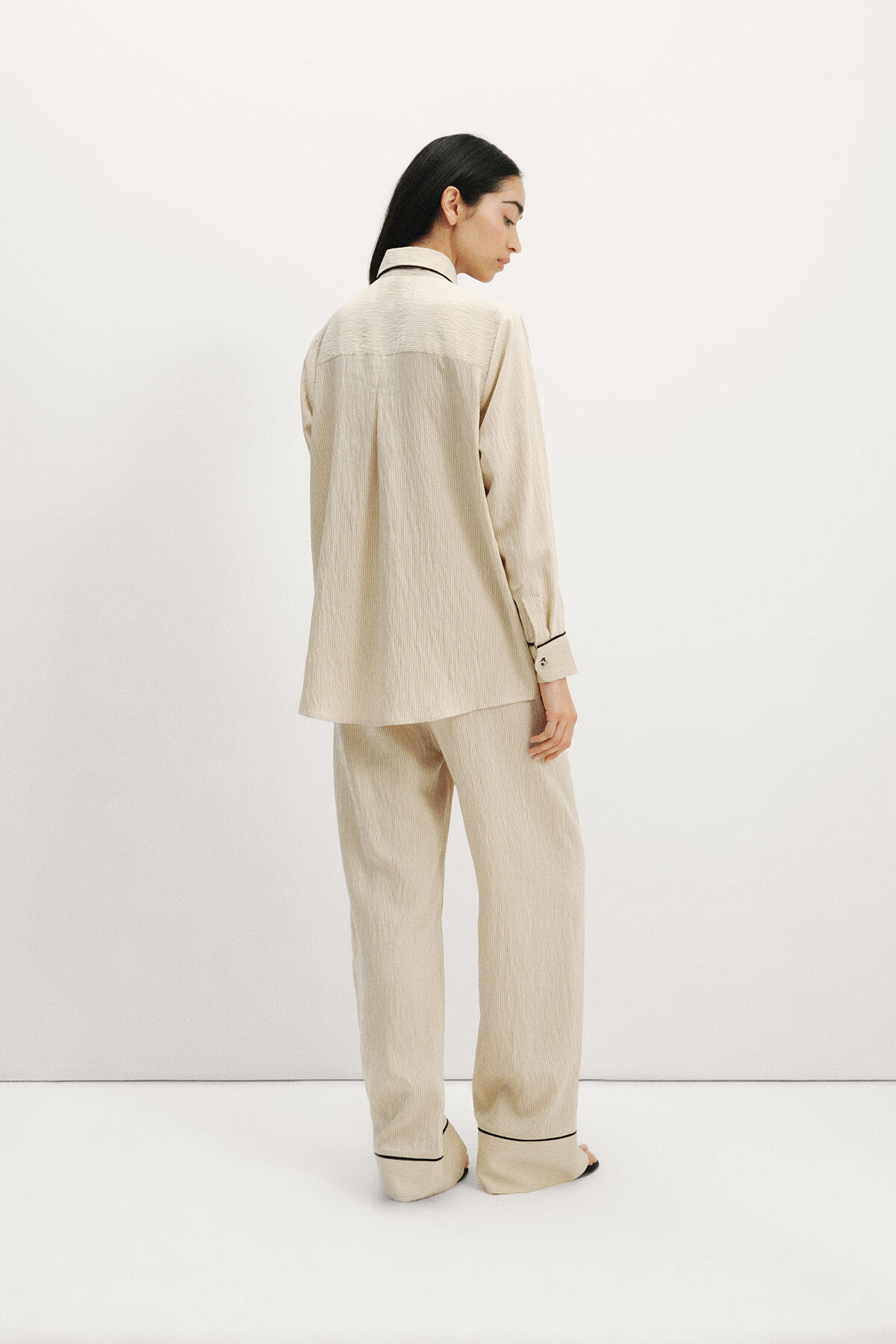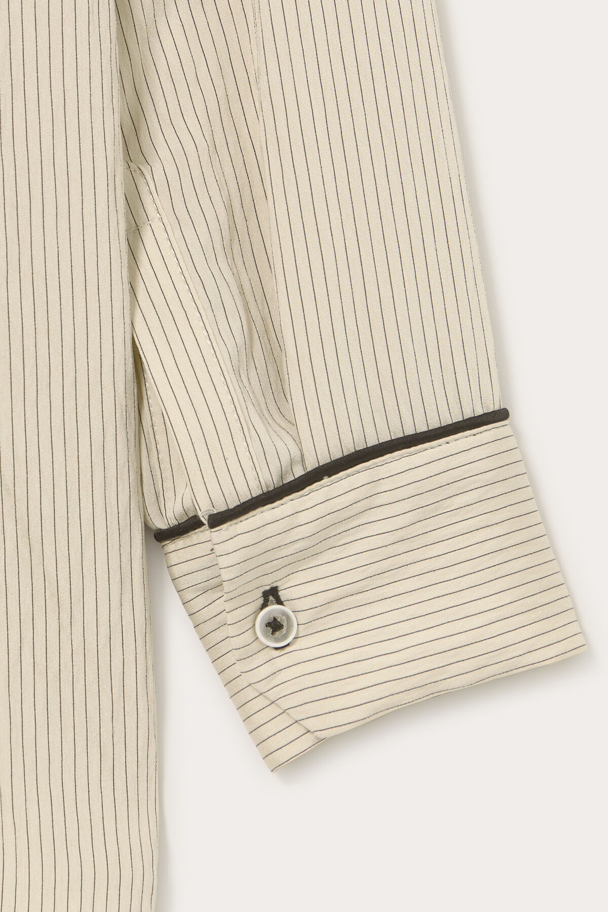 This ivory shirt stands out with its black striped pattern and black binding details on the collar and cuffs, enhancing its elegance. The embroidered details add a delicate touch to the design, while the oversized fit offers comfortable wear. Crafted from a modal blend fabric, this shirt is both soft and breathable, providing the perfect balance of style and comfort for everyday wear. Whether for work or weekend outings, this shirt is a wardrobe essential that will elevate your style.