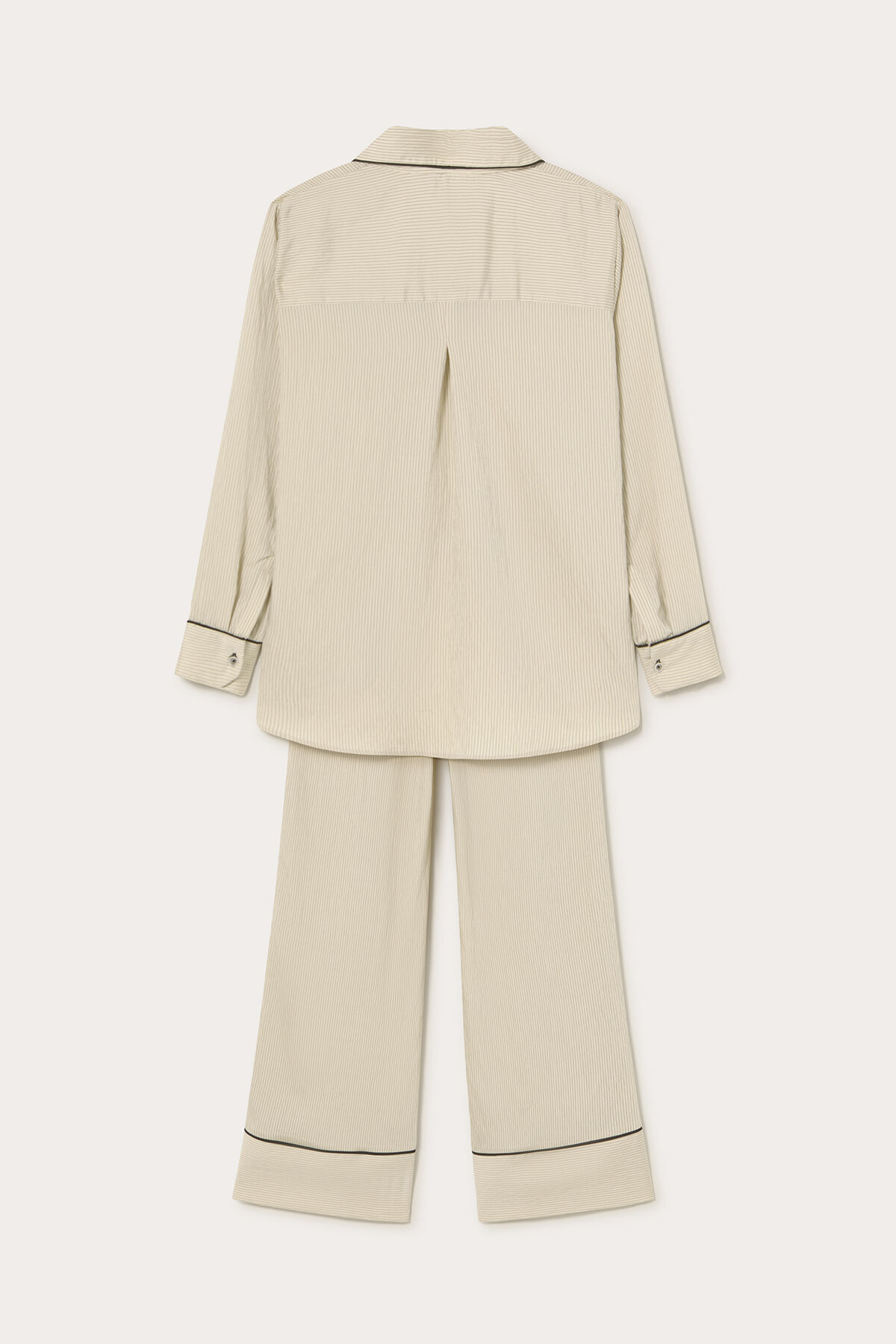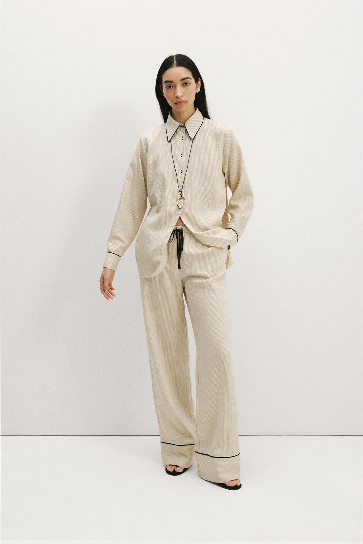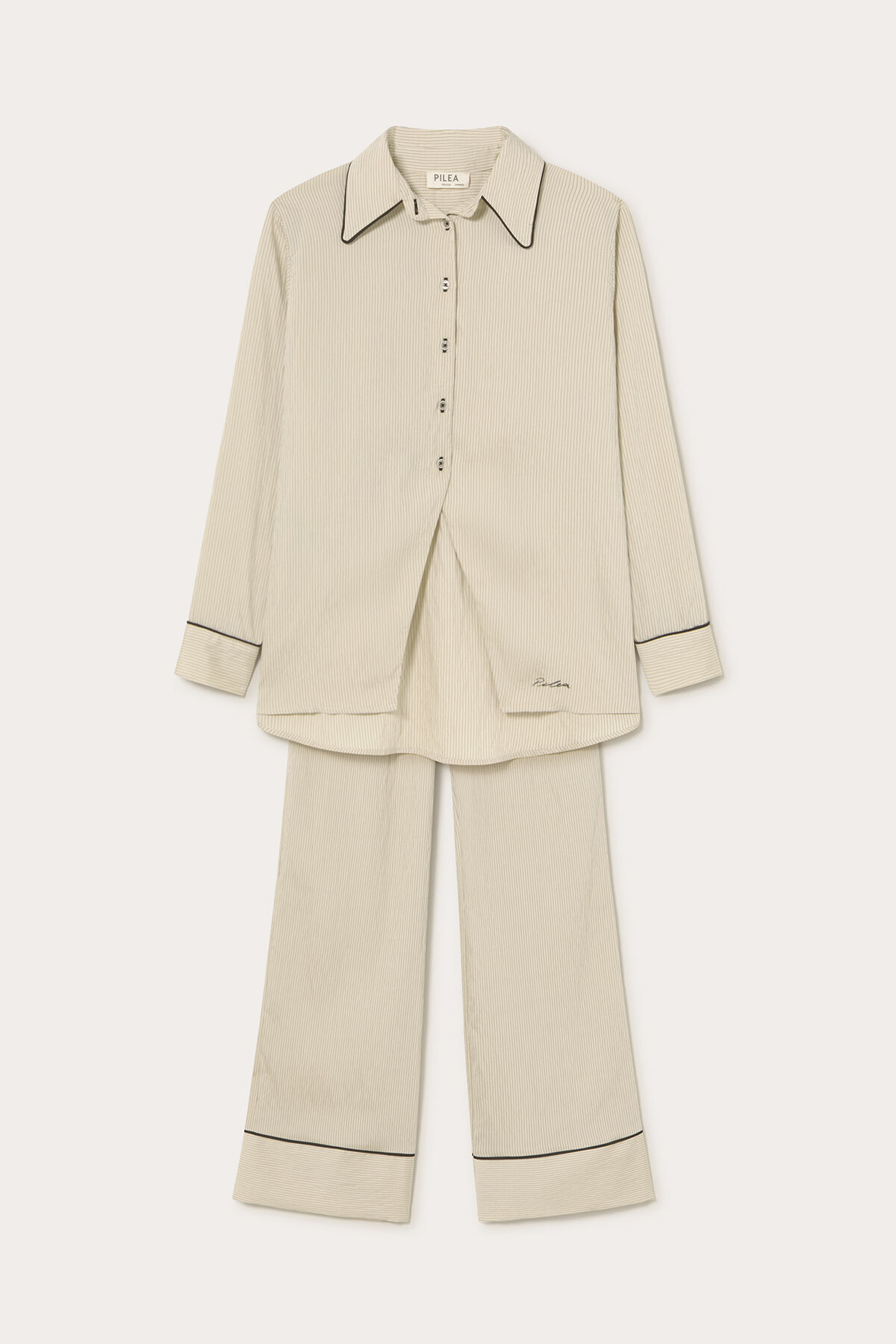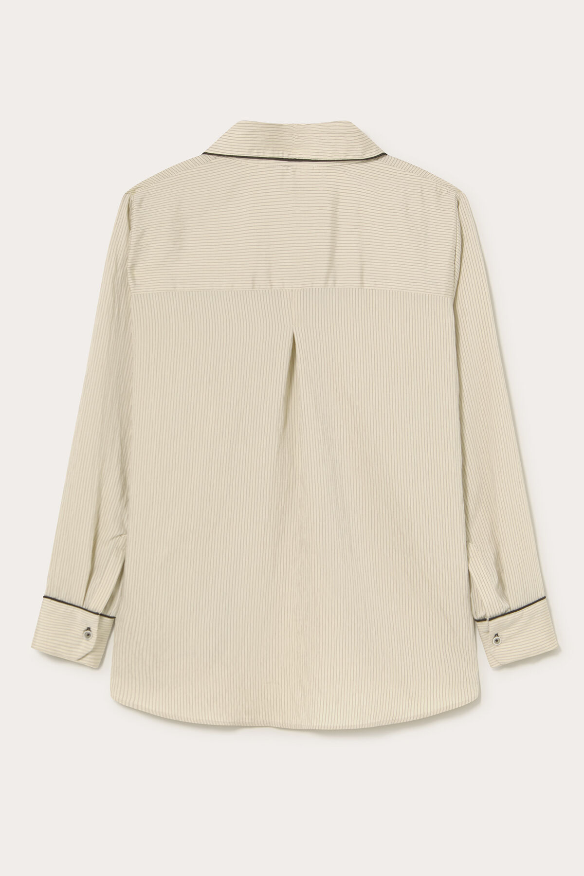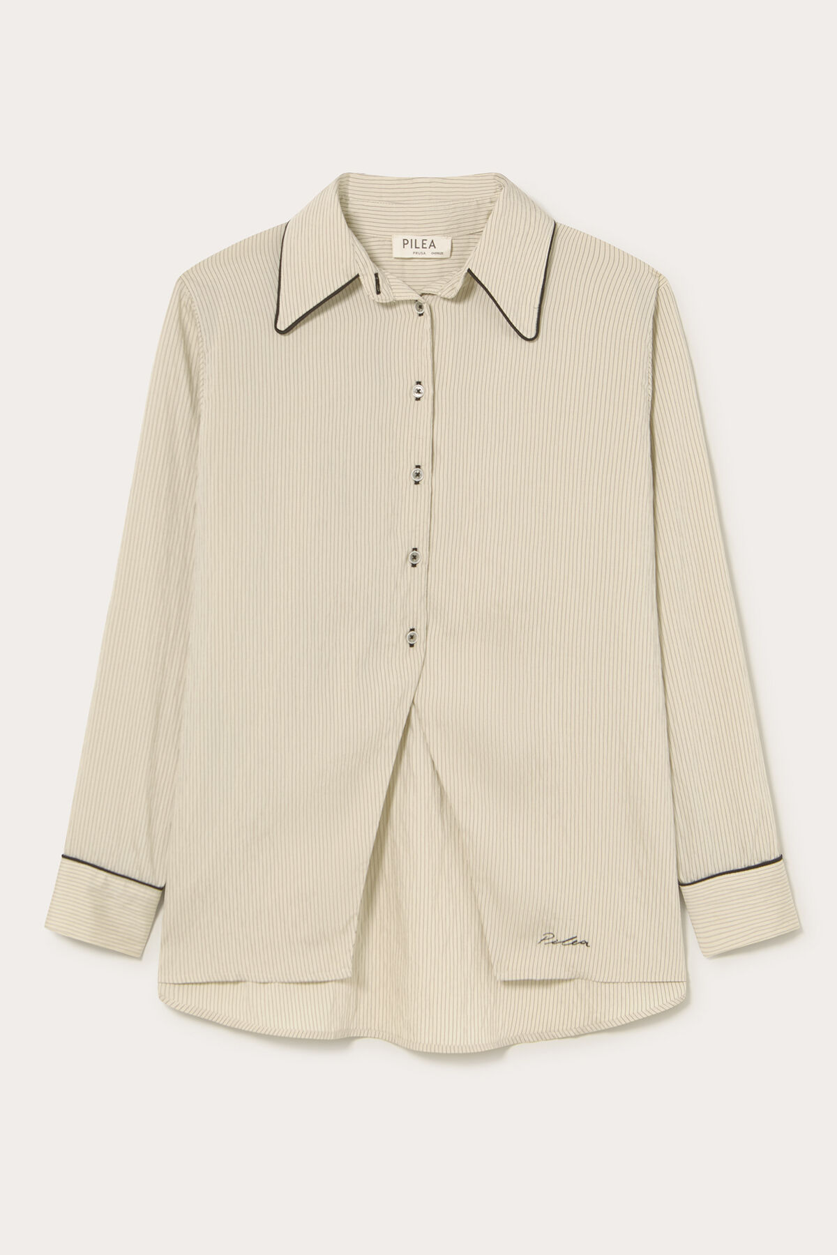 Gelince Haber VerKrem üzeri siyah çizgili yaka ve manşetleri siyah biye detaylı nakışlı geniş kesim modal karışımlı kumaştan gömlek.