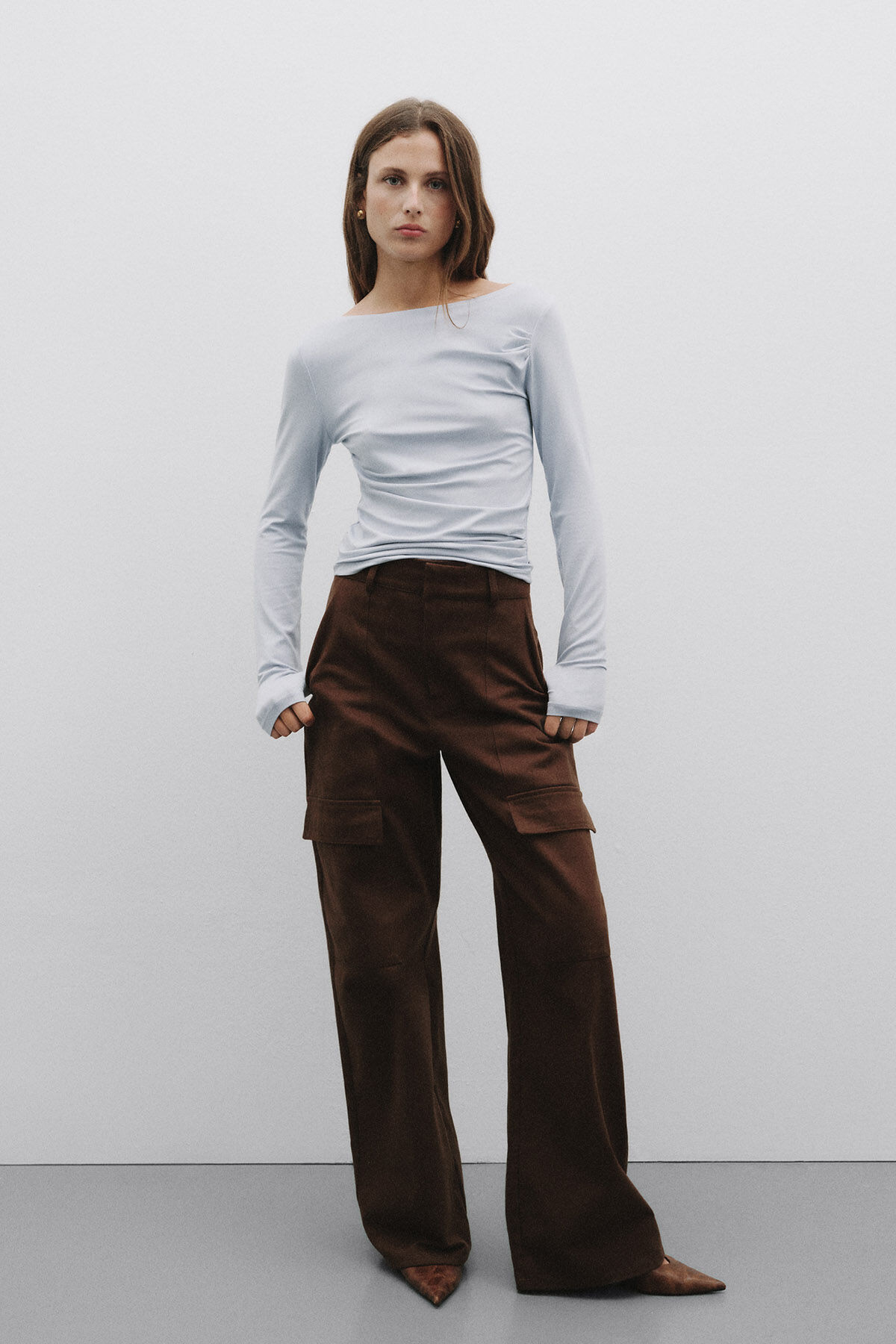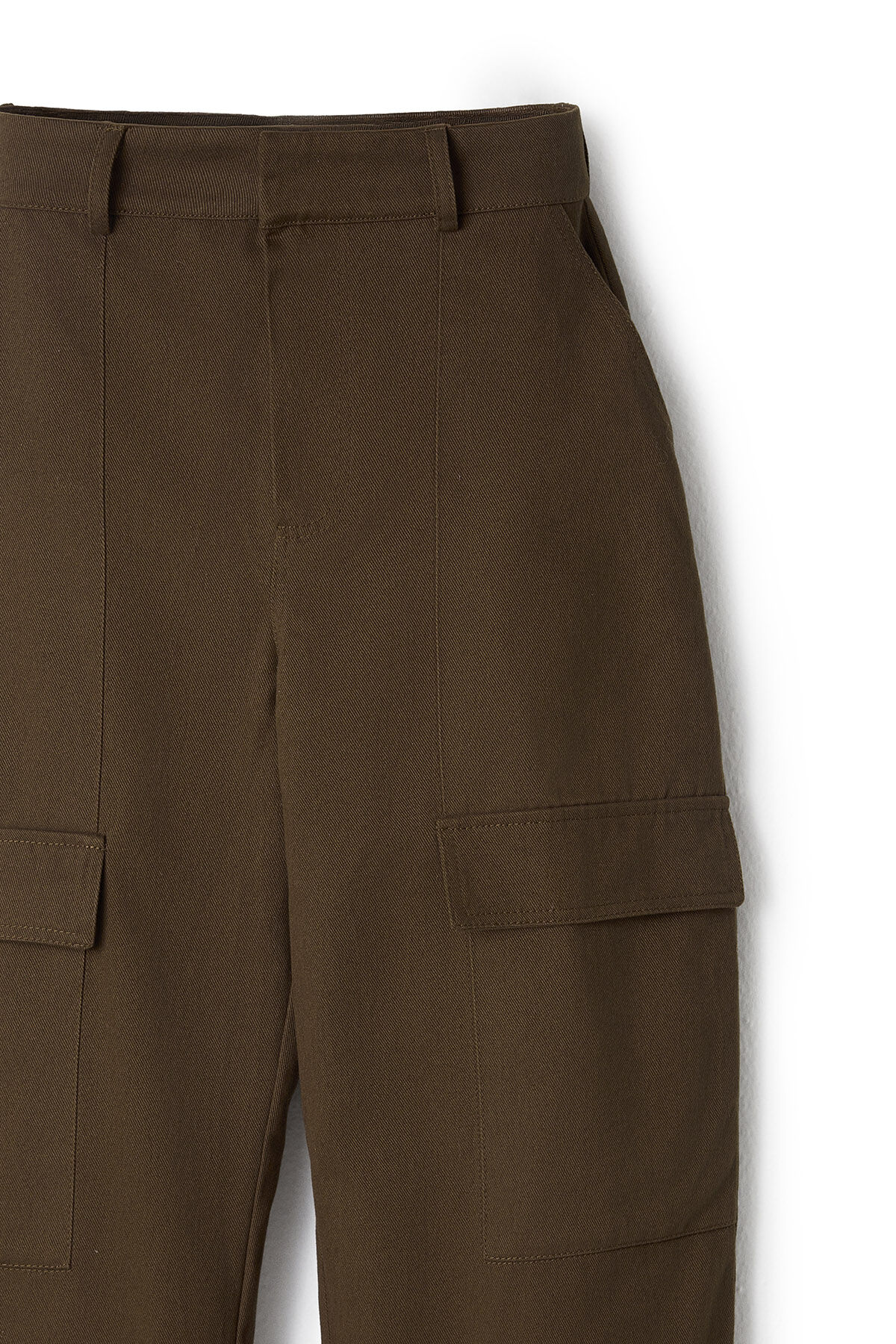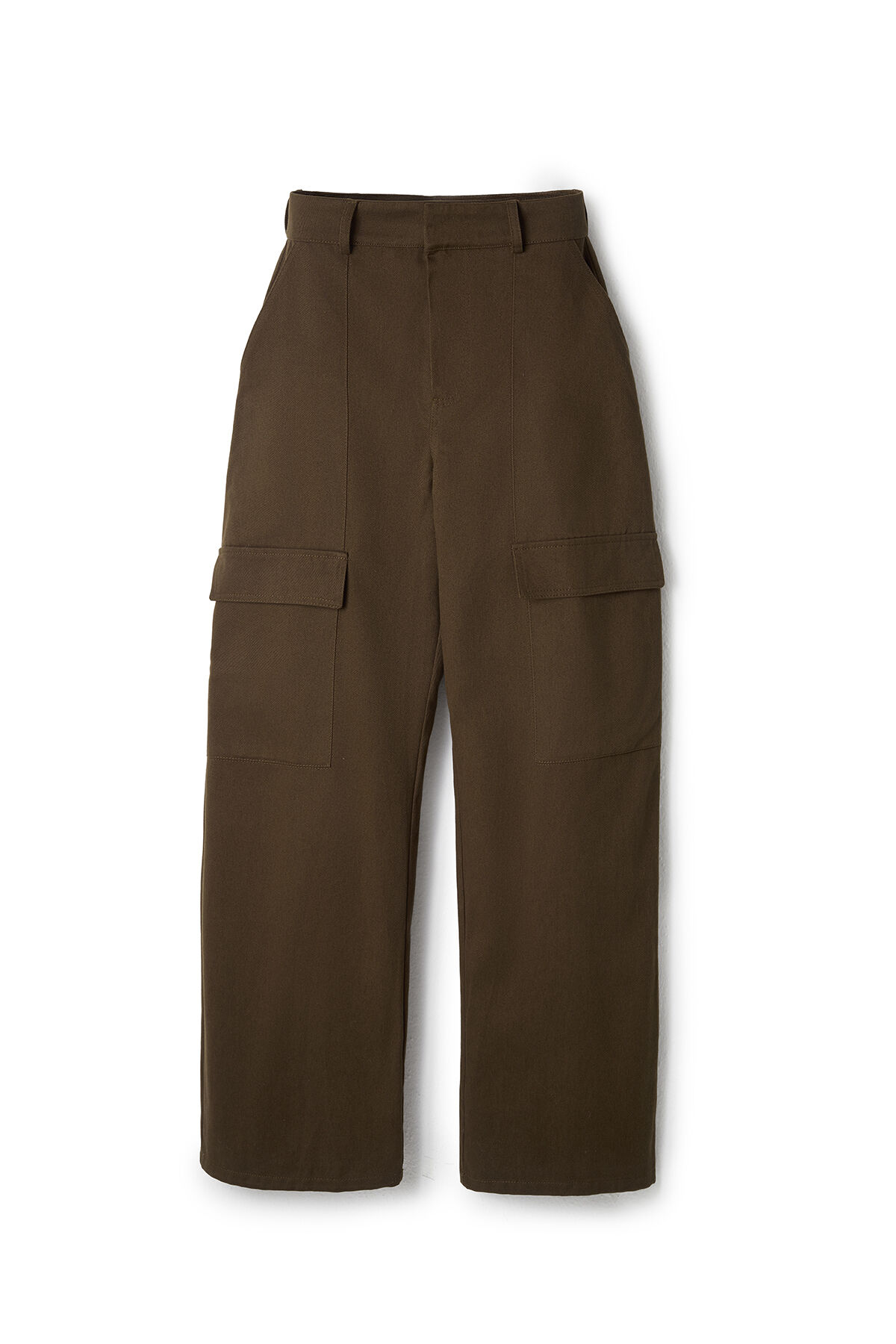 Gelince Haber VerKoyu kahverengi pamuk gabardin kumaştan yüksek bel kargo cepli geniş kesim pantolon.