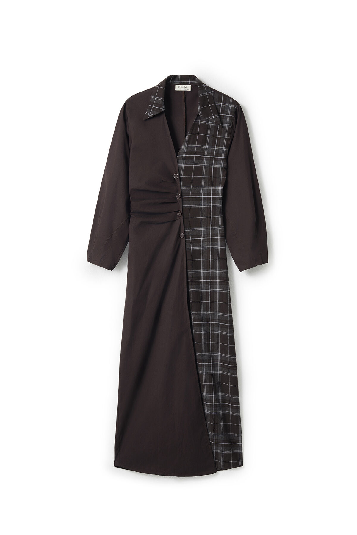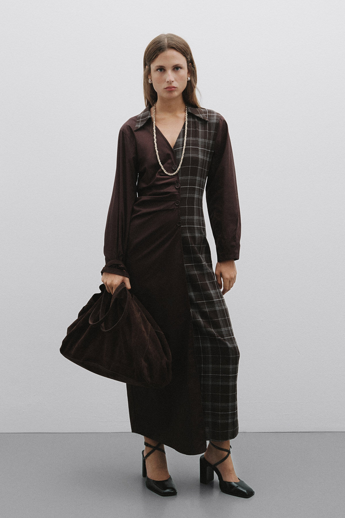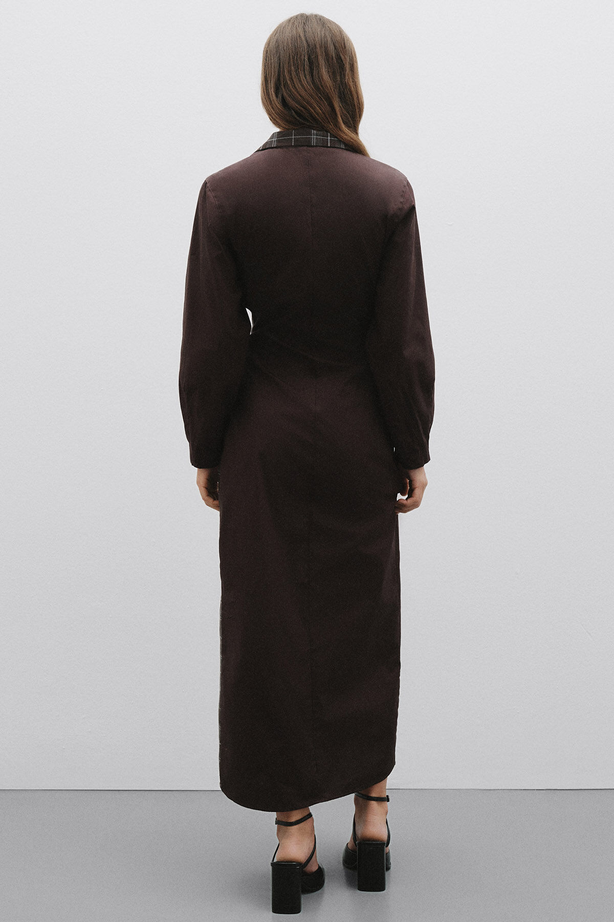 Gelince Haber VerKoyu kahve pamuk kumaş ve ekose desenli pamuk karışımlı kumaş kombinli anvelop büzgülü kapamalı gömlek yaka uzun kollu maksi boy elbise.