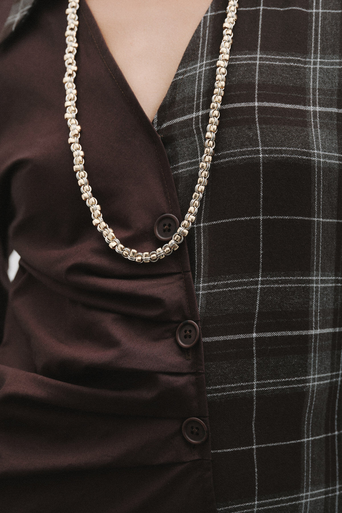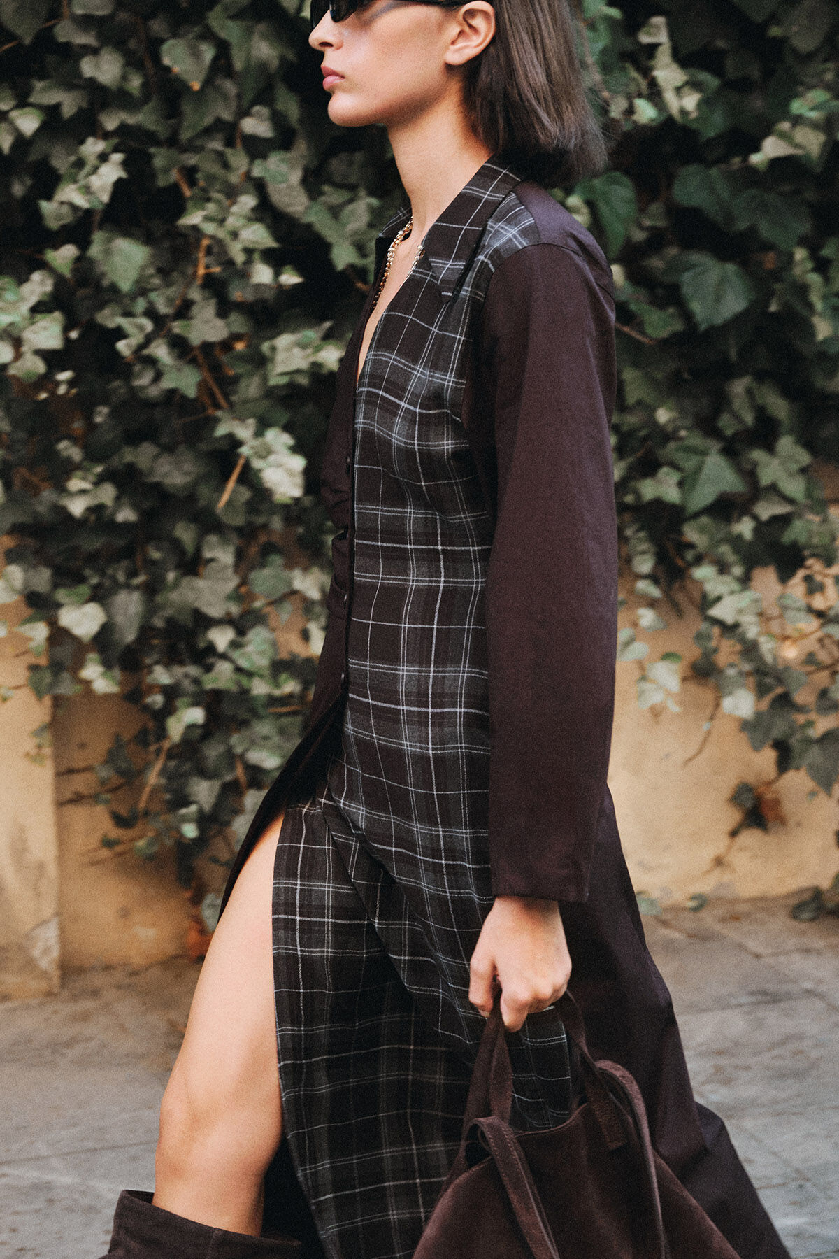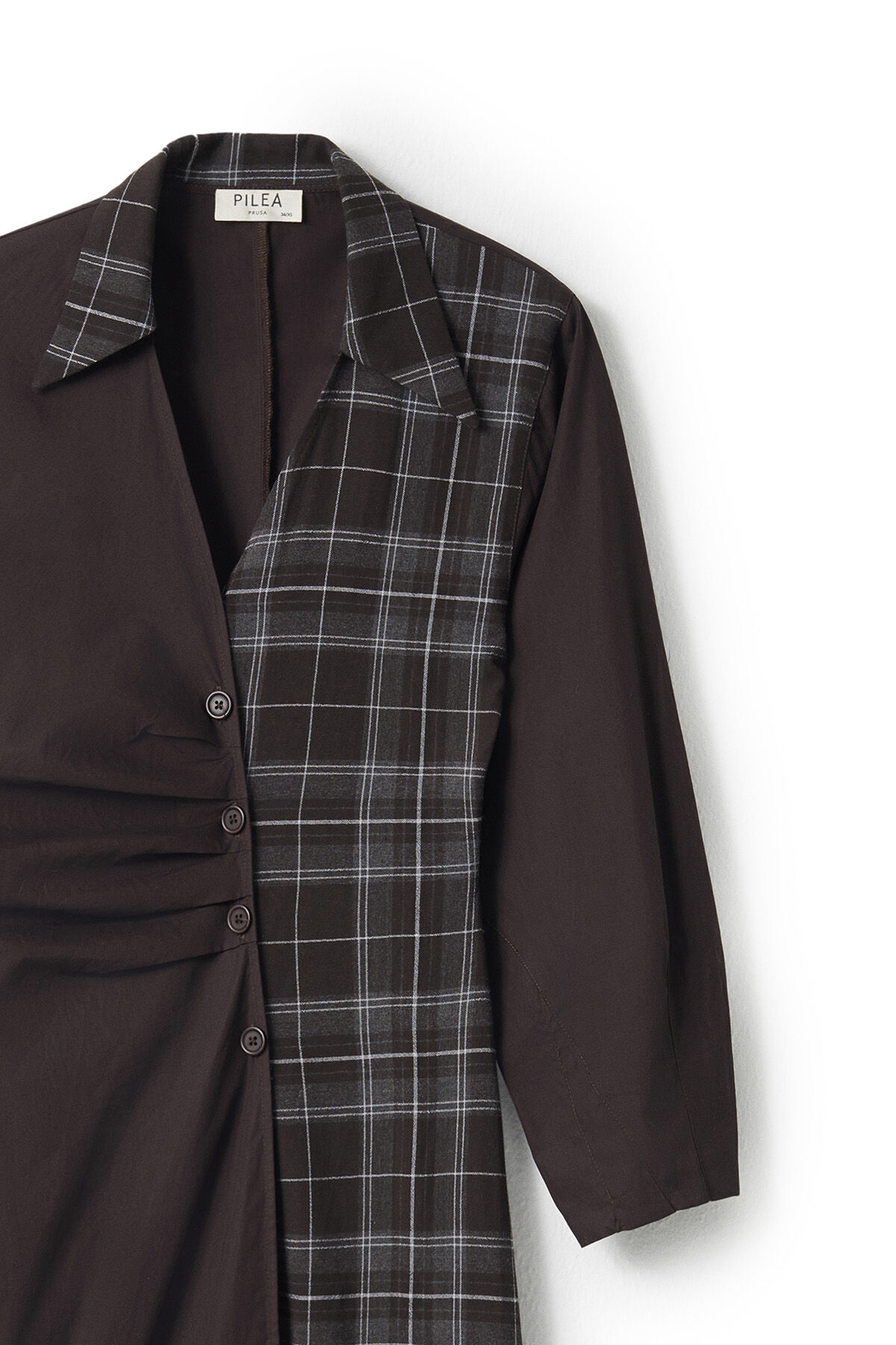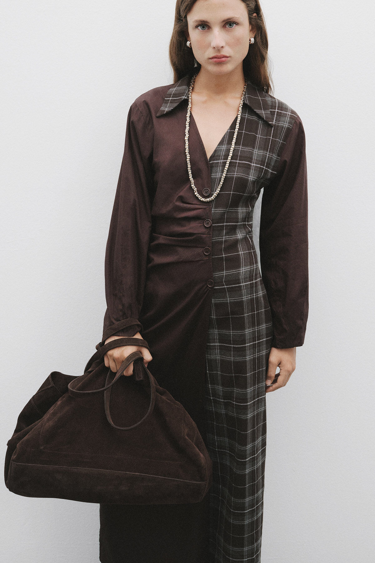 Gelince Haber VerKoyu kahve pamuk kumaş ve ekose desenli pamuk karışımlı kumaş kombinli anvelop büzgülü kapamalı gömlek yaka uzun kollu maksi boy elbise.