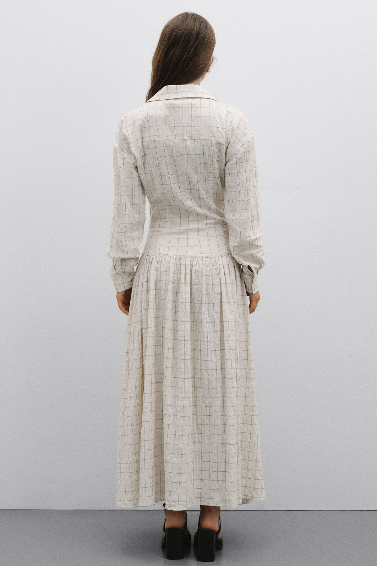 Gelince Haber VerBej rengi kareli üst bedeni fit kesim kloş etekli uzun kollu önden düğmeli pamuk kumaştan maksi boy gömlek elbise.