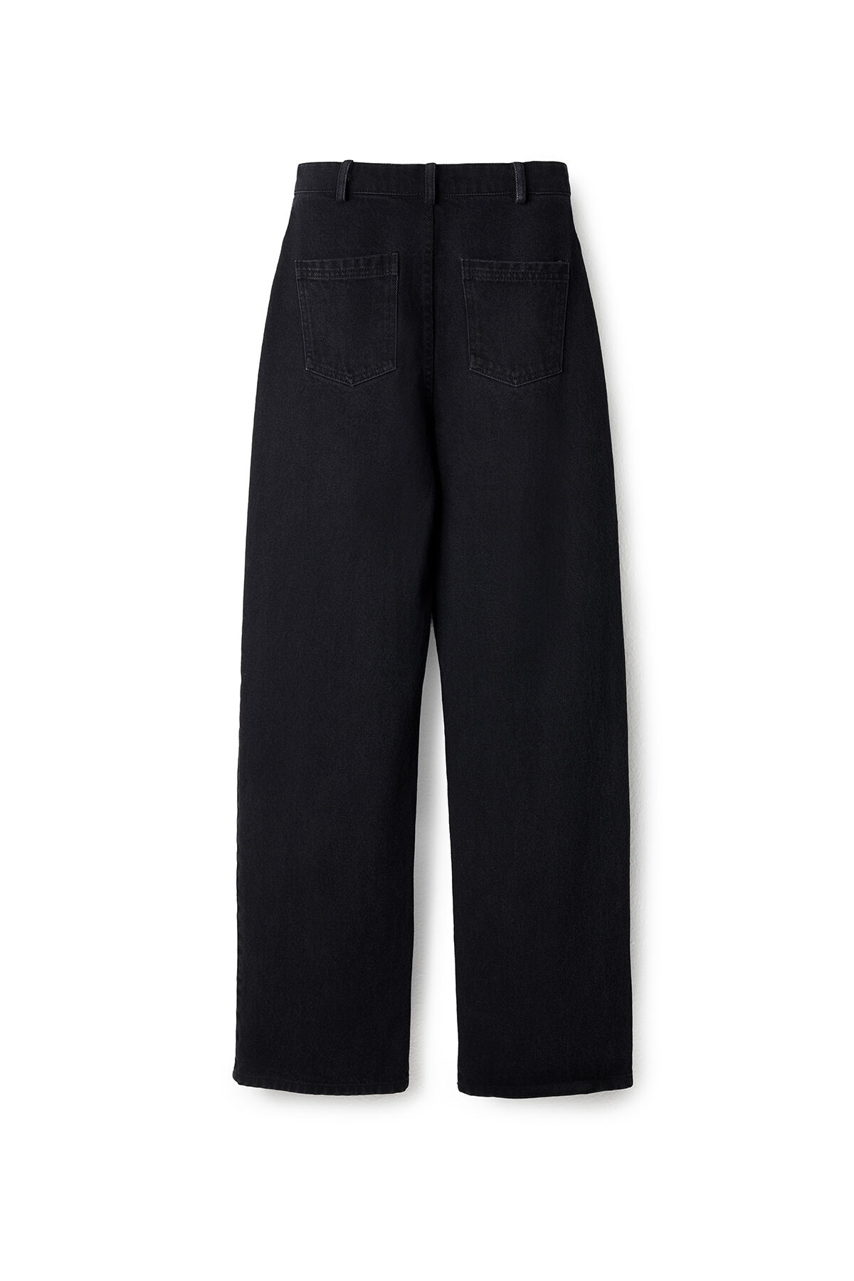 Notify me when its in stockHigh-waisted black cotton denim pants with pockets, wide legs, front zipper, and metal button closure