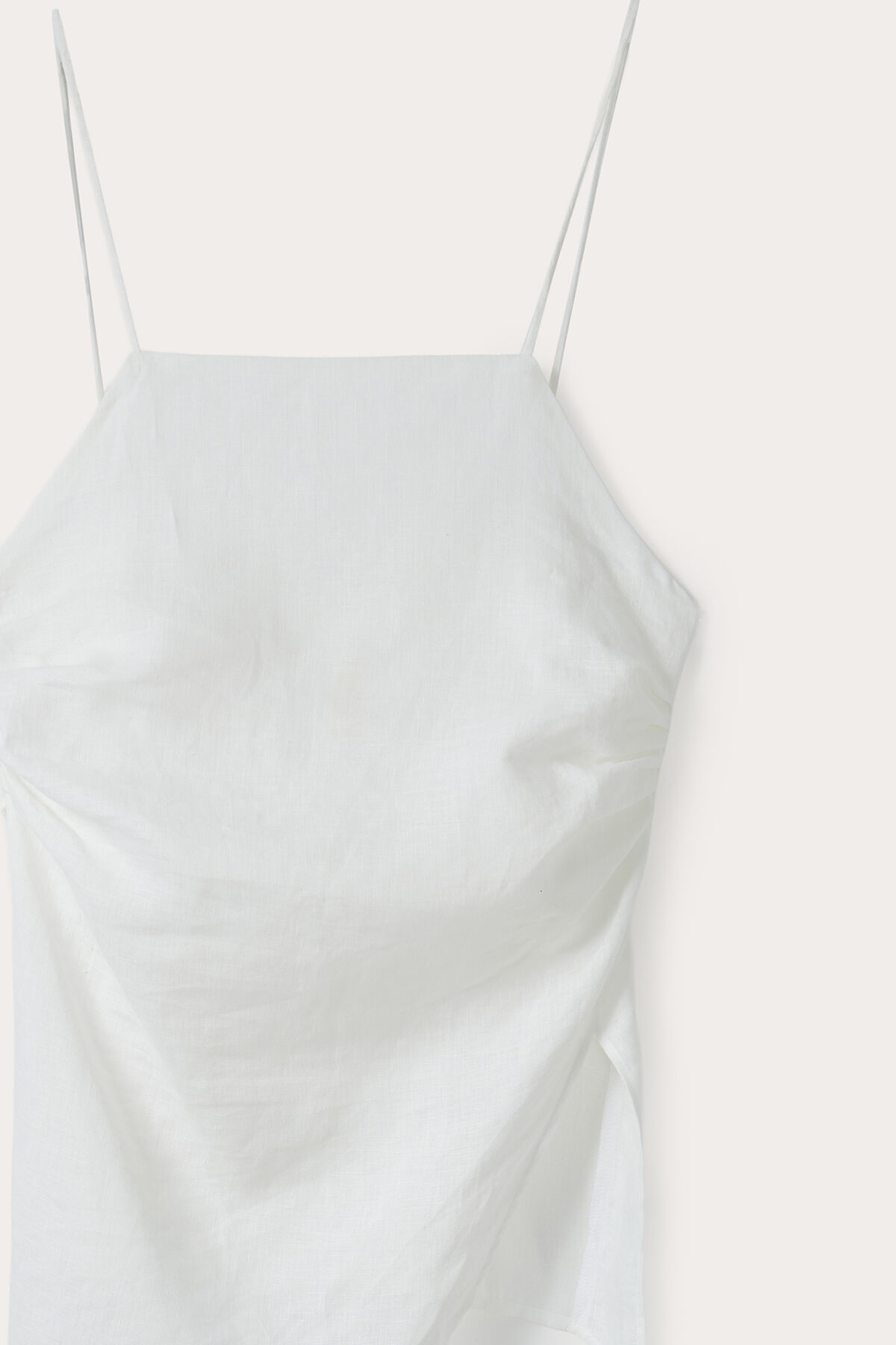 Gelince Haber Verİp askılı asimetrik eksim arkadan ip bağlamalı ekru rengi keten kumaştan bluz.