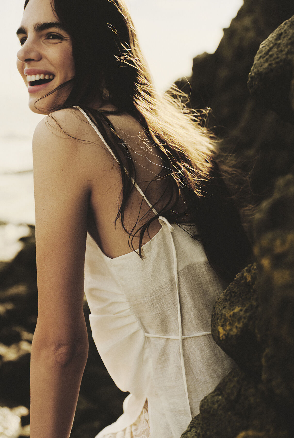 Zarif ve modern bir stil sunan bu ekru renkli bluz, ip askılı ve asimetrik kesimiyle dikkat çeker. Arkadan bağlamalı tasarımı, vücuda tam oturan feminen bir siluet oluştururken, keten kumaşı ile hafif ve nefes alabilir bir kullanım sunar. Yaz aylarının favorisi olmaya aday bu bluz, hem günlük kombinlerde hem de özel günlerde şık bir görünüm sağlar.