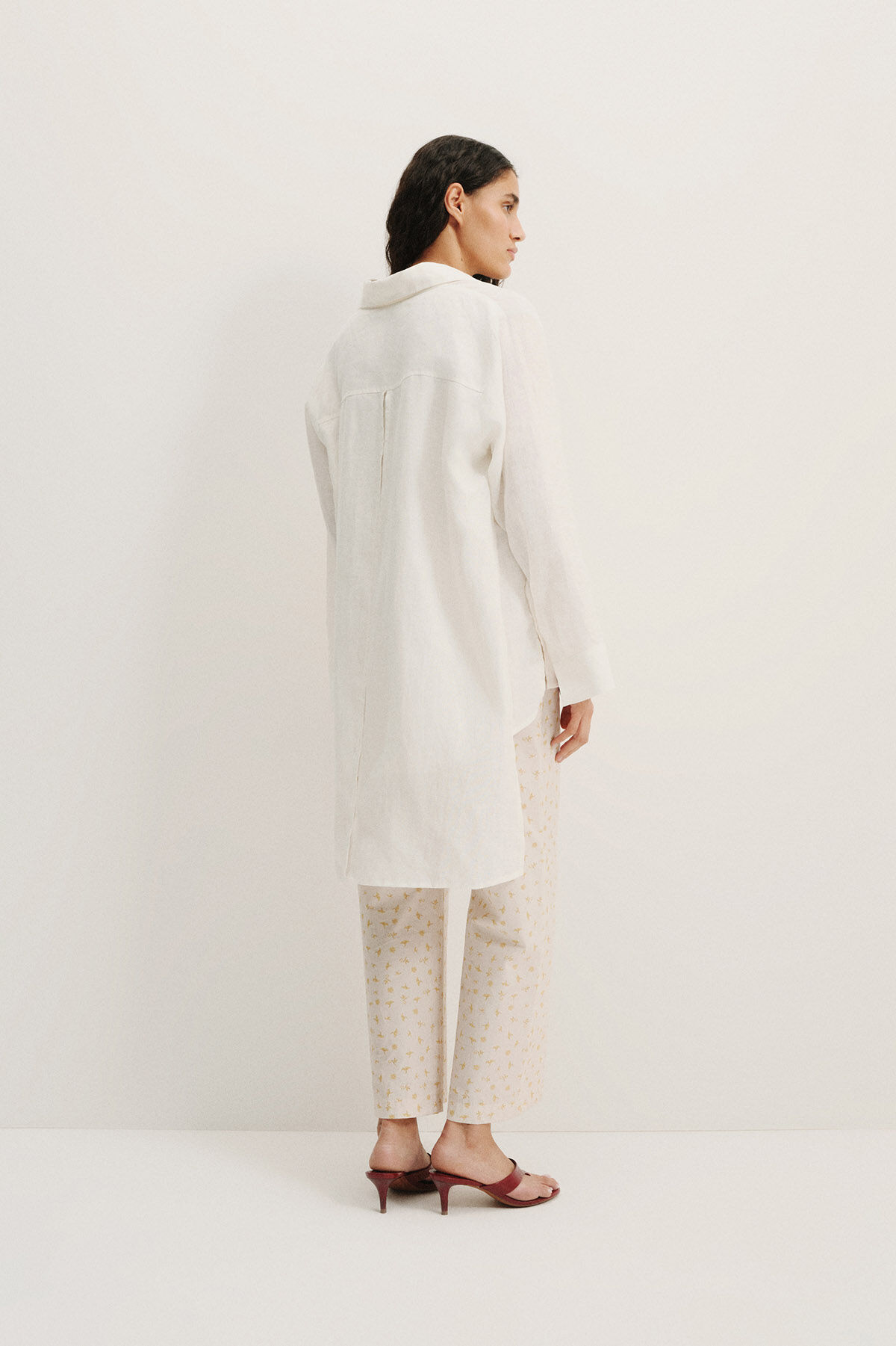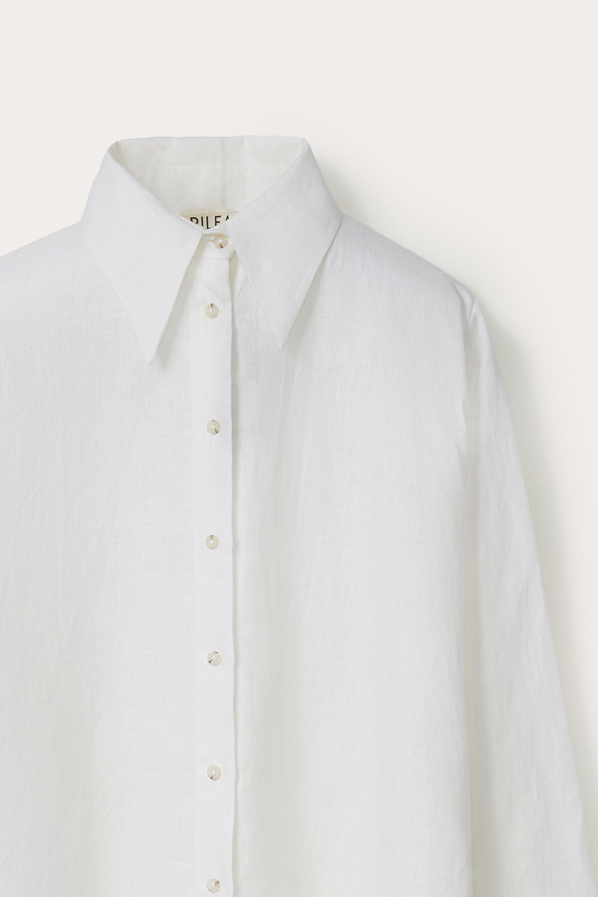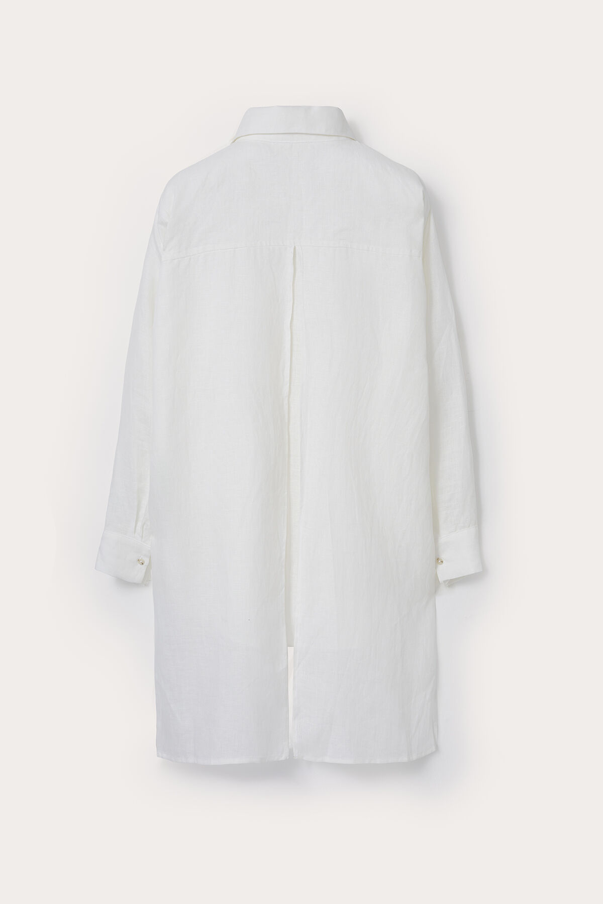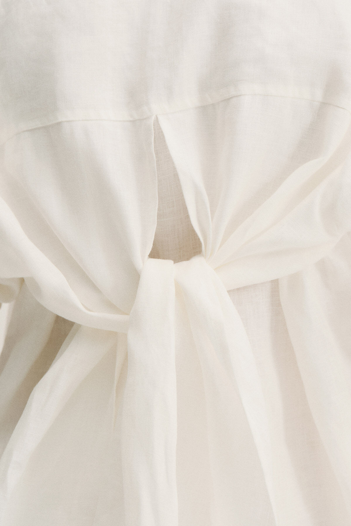 Gelince Haber VerBeyaz geniş yakalı arkadan bağlama detaylı keten kumaş geniş kesim gömlek.