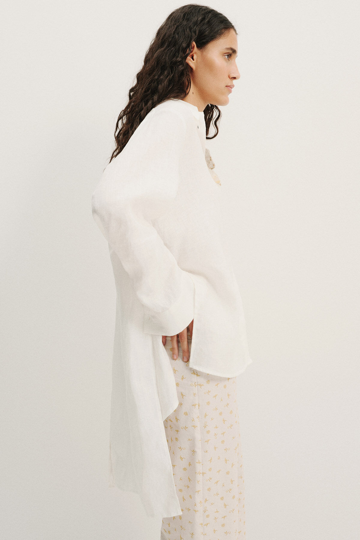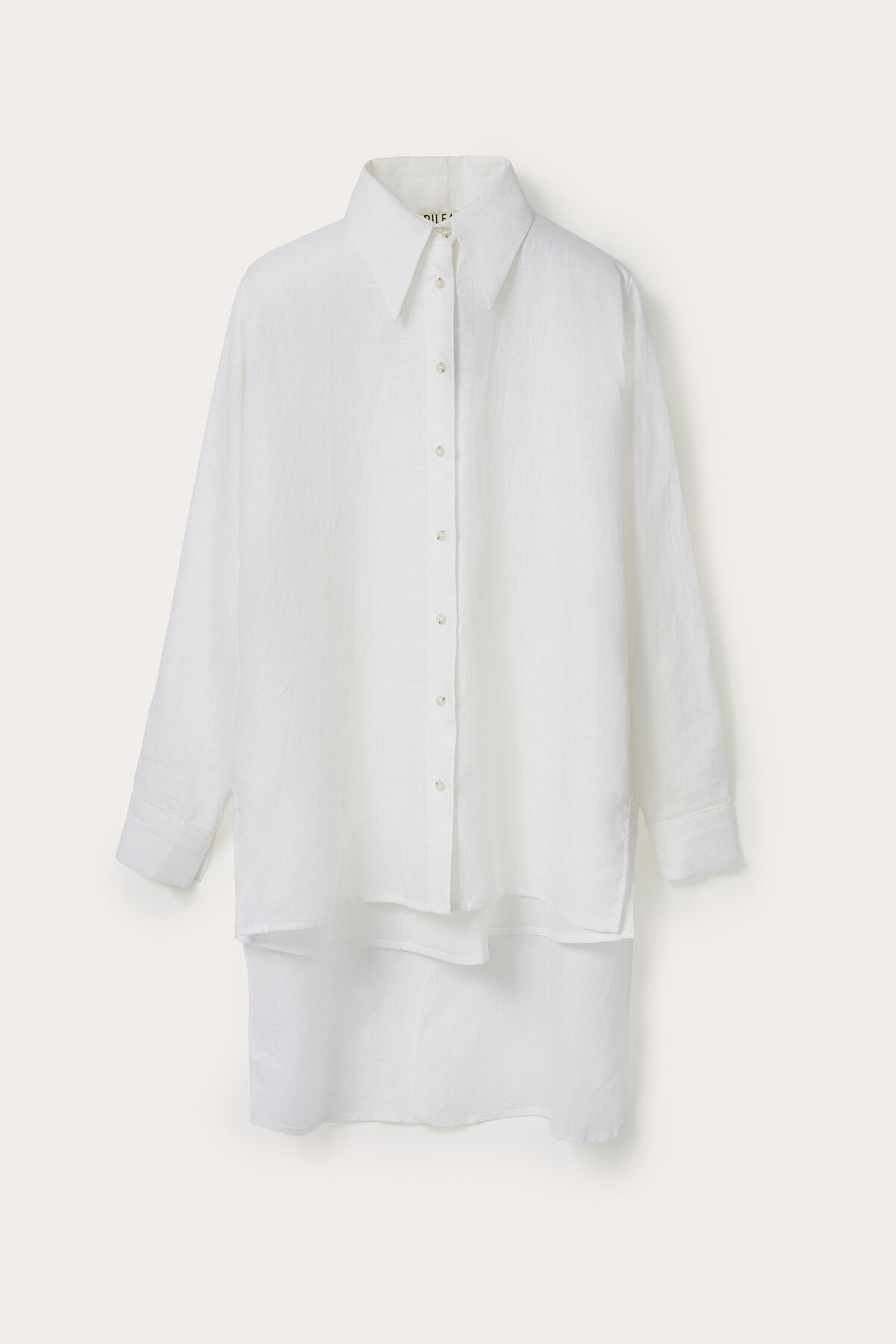 Combining elegance with contemporary style, this white oversized shirt stands out with its wide collar and back tie detail. Made from 100% breathable linen fabric, it provides comfort on warmer days while maintaining a relaxed yet chic silhouette. Perfect for everyday wear or office outfits, this timeless piece is a versatile addition to any wardrobe.