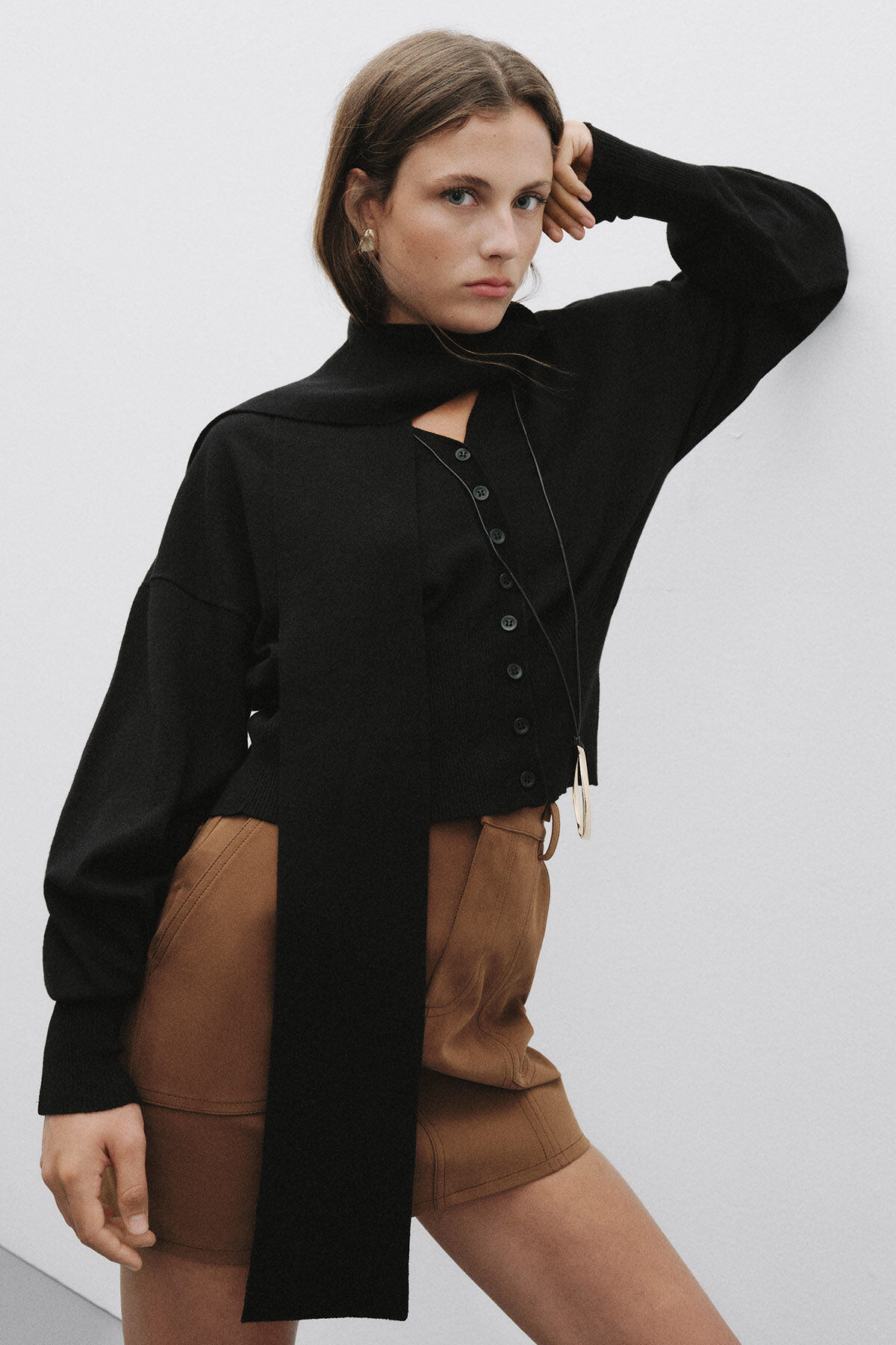 Notify me when its in stockBlack long sleeve fitted cardigan with narrow cuffs, front button closure, and scarf accessory in viscose blend knit fabric