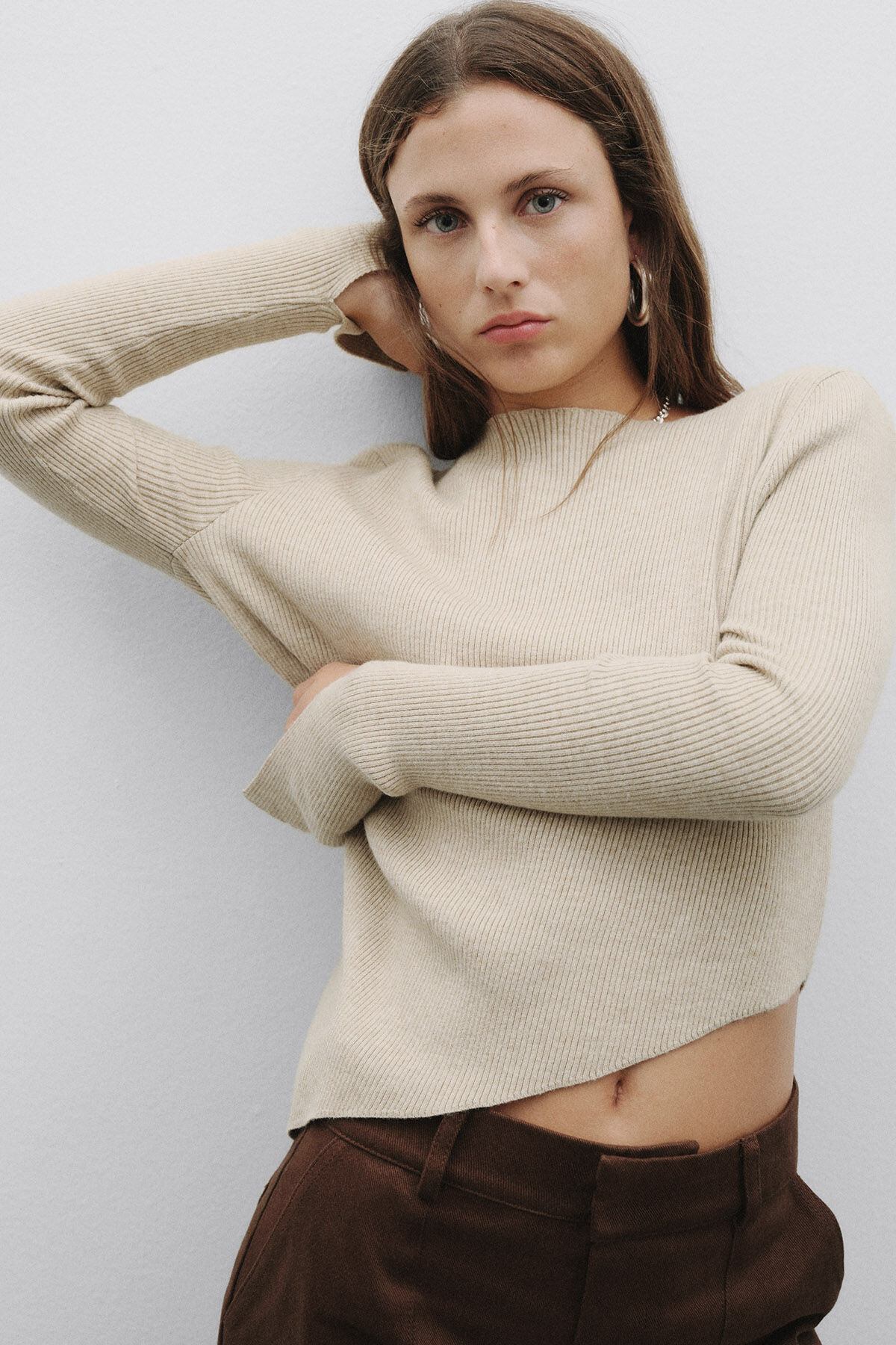 Notify me when its in stockBeige boat neck asymmetrical long sleeve slit cuff slim fit sweater in viscose blend fabric