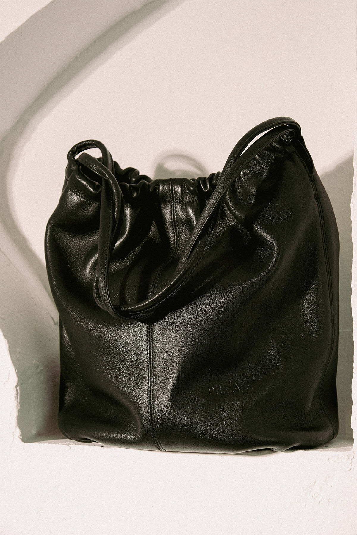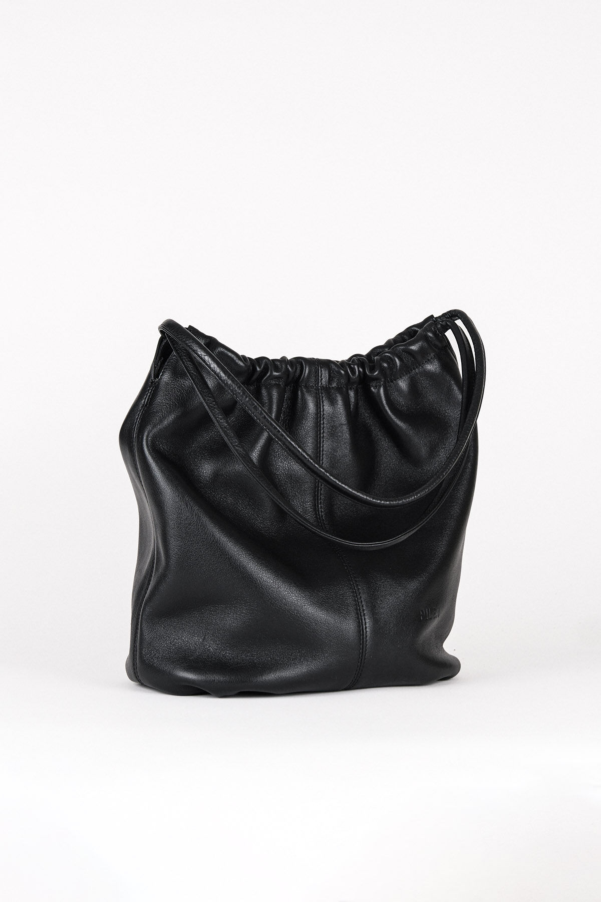 Notify me when its in stockBlack leather gathered bag with dual handles, removable shoulder strap, lined interior with double pockets, magnetic closure, and printed logo