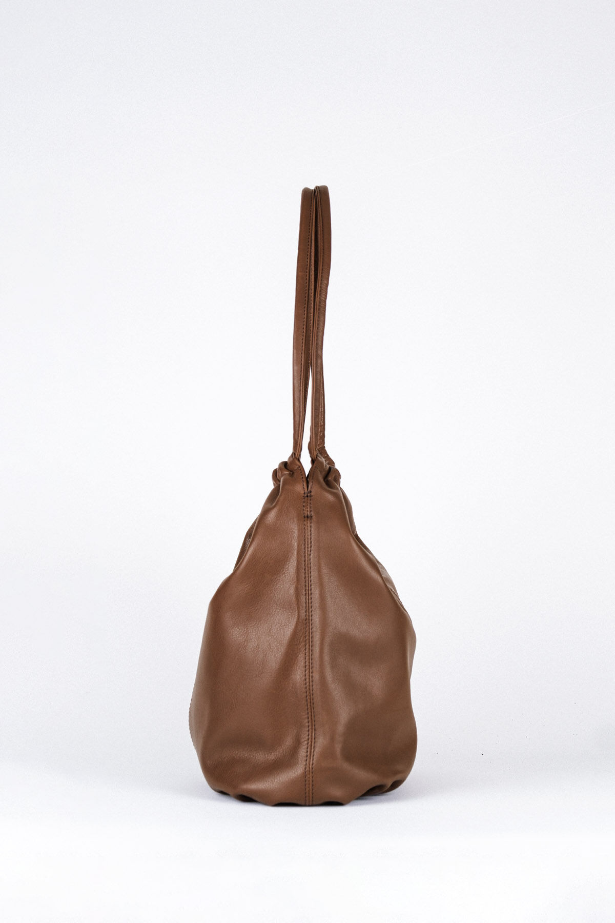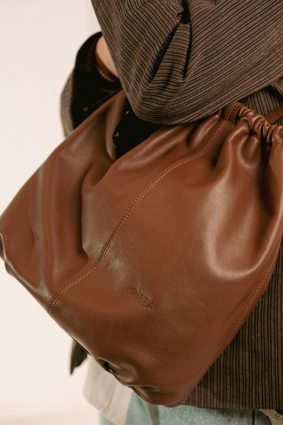 Notify me when its in stockBrown leather gathered bag with dual handles, removable shoulder strap, lined interior with double pockets, magnetic closure, and printed logo
