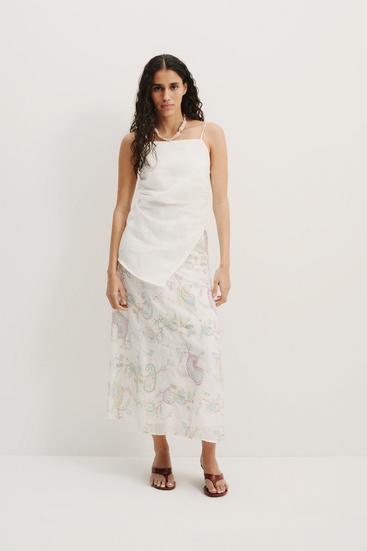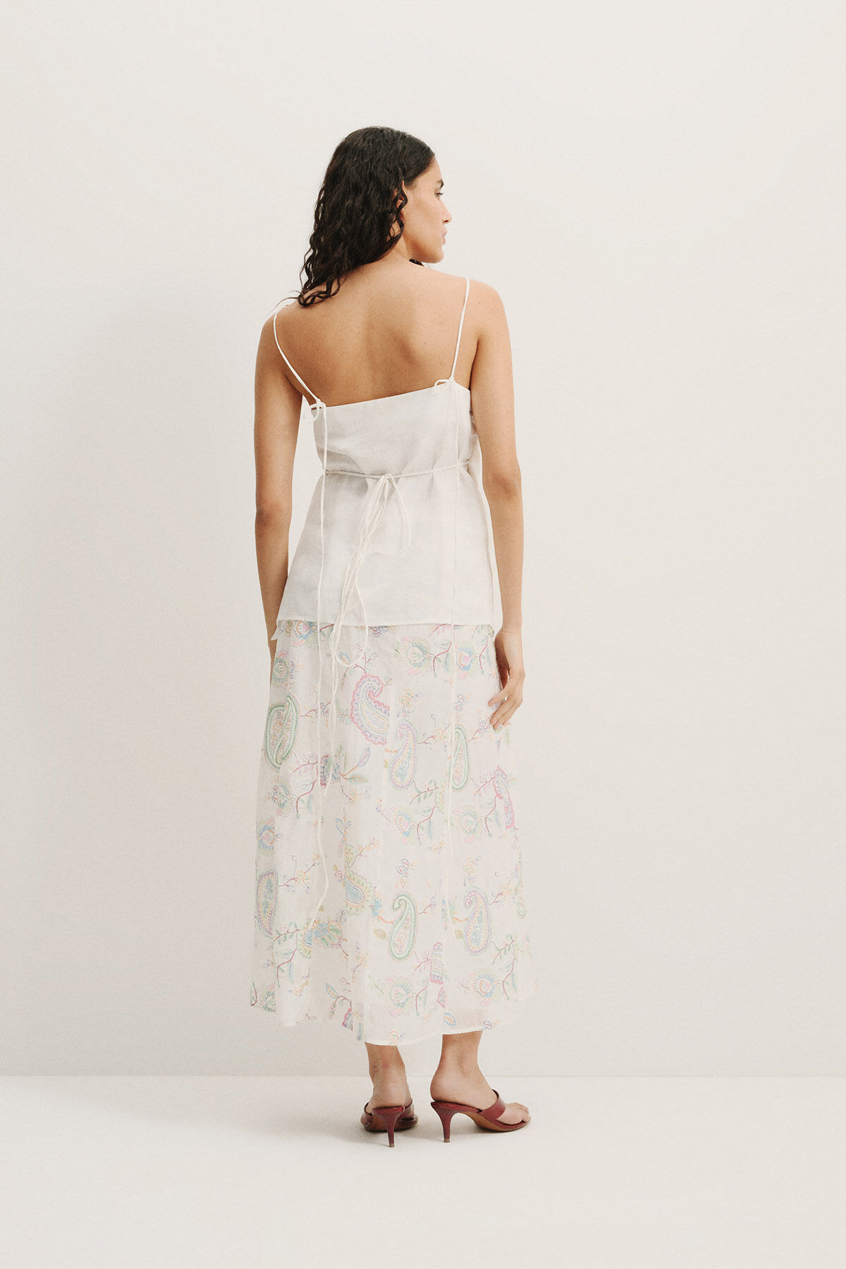 Chic and contemporary, this ecru-colored linen blouse features delicate spaghetti straps and a stylish asymmetric hemline. The back-tie detail provides an adjustable and flattering fit, while the 100% linen fabric offers breathability and comfort. Perfect for warm-weather looks, this blouse adds effortless elegance to both casual and elevated outfits.