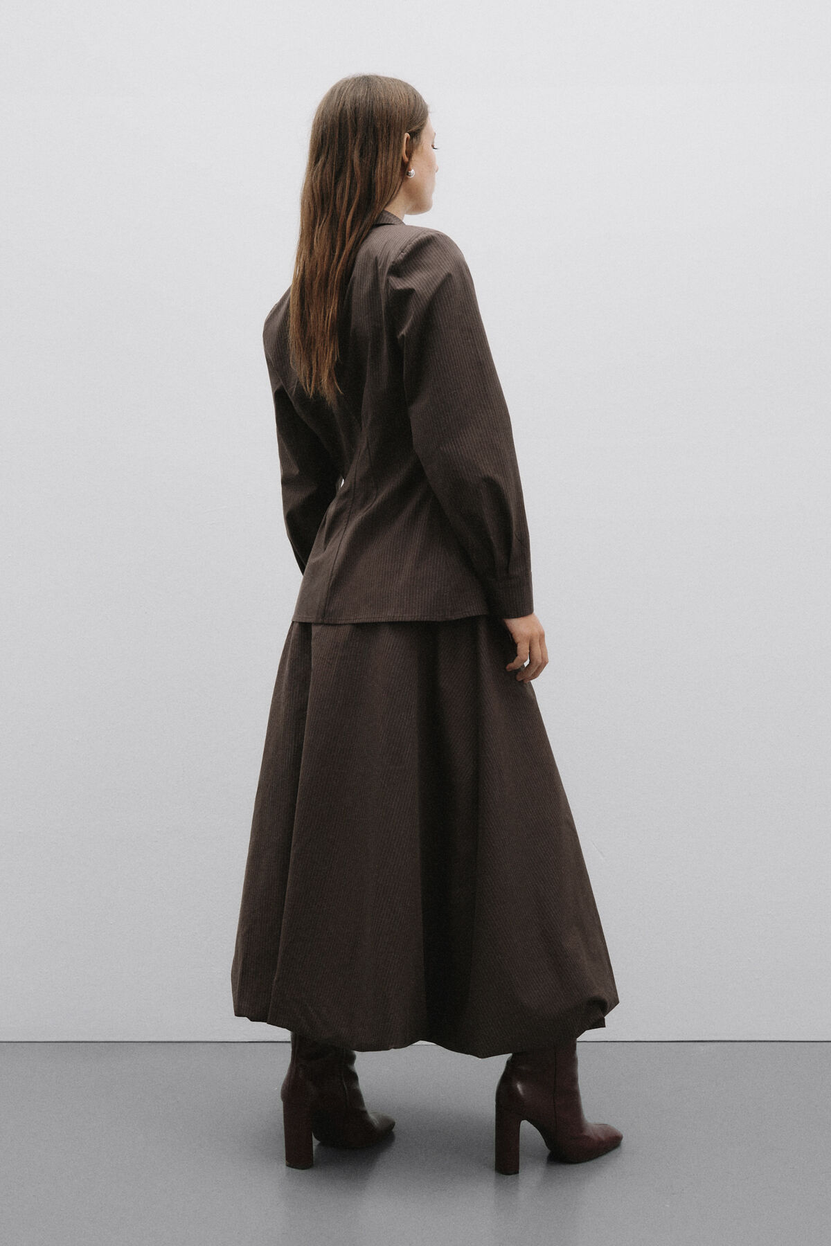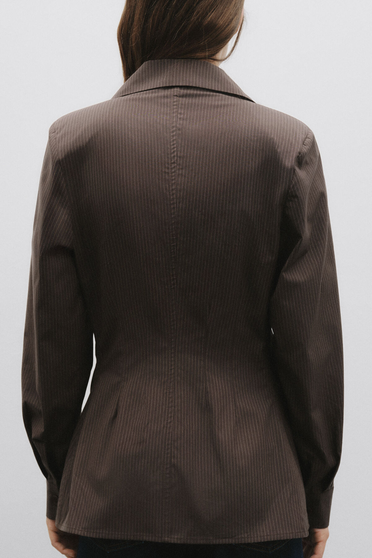 Notify me when its in stockBrown striped cotton shirt with lapel collar, long sleeves with cuffs, double-breasted design, and single front button closure, slim fit