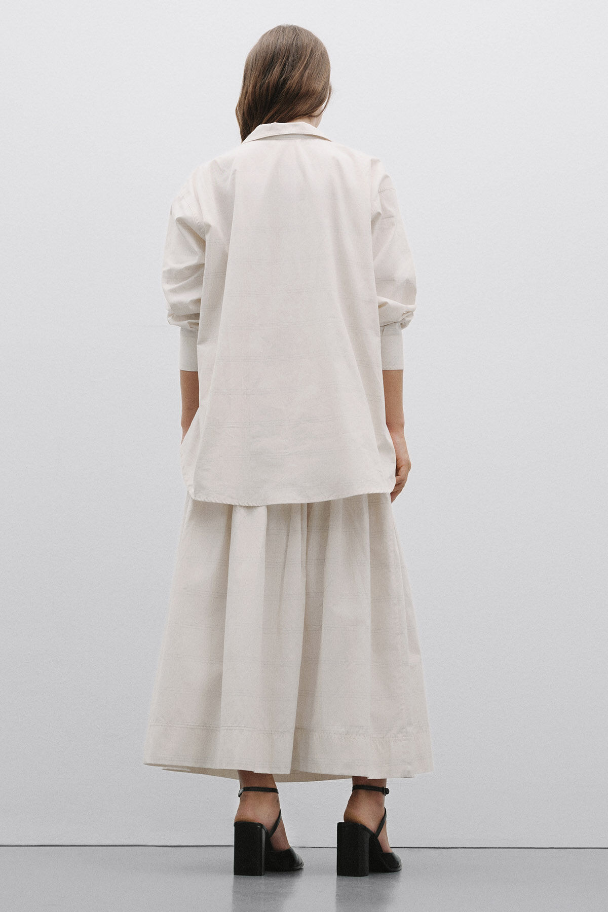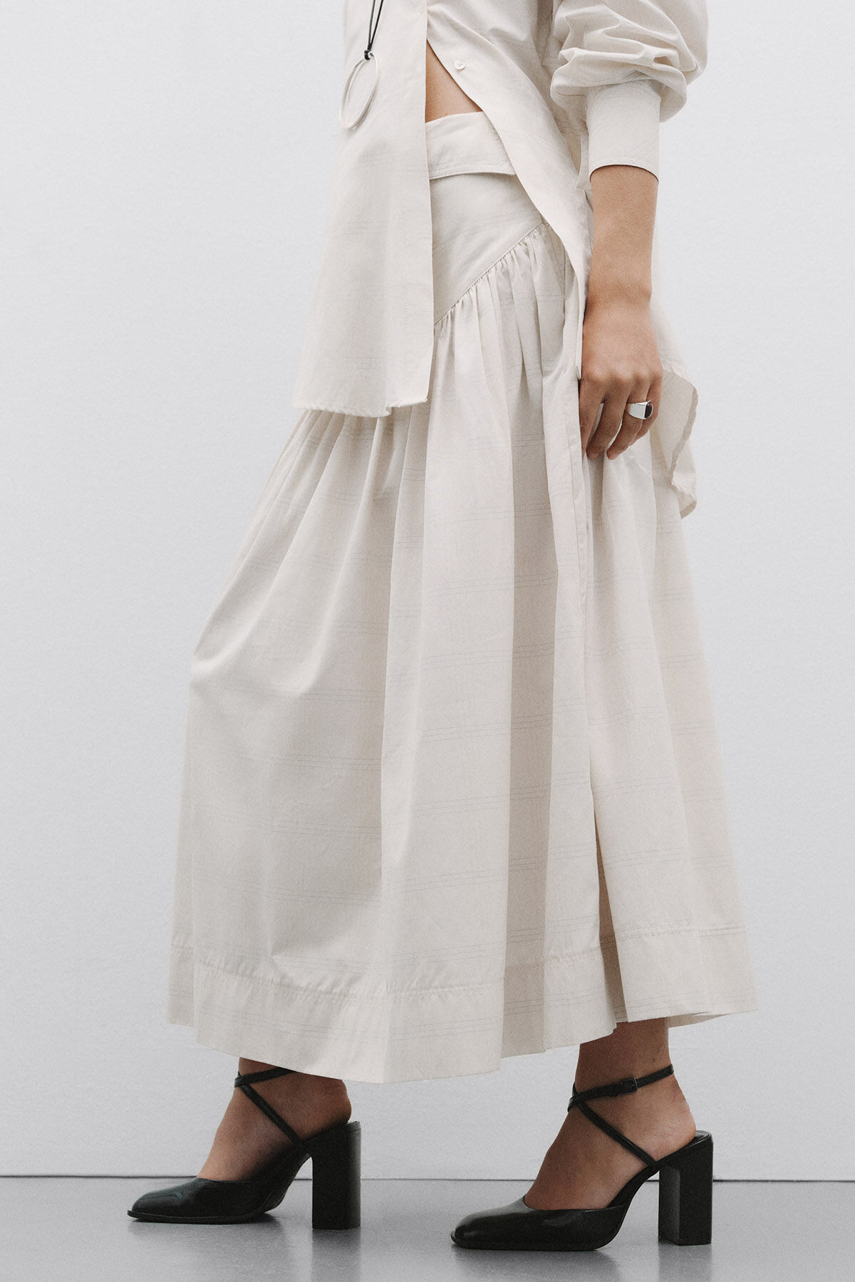 Gelince Haber VerBej rengi ekoseli pamuk kumaştan bel detaylı basene oturan alt kısmı büzgülü maksi boy etek.