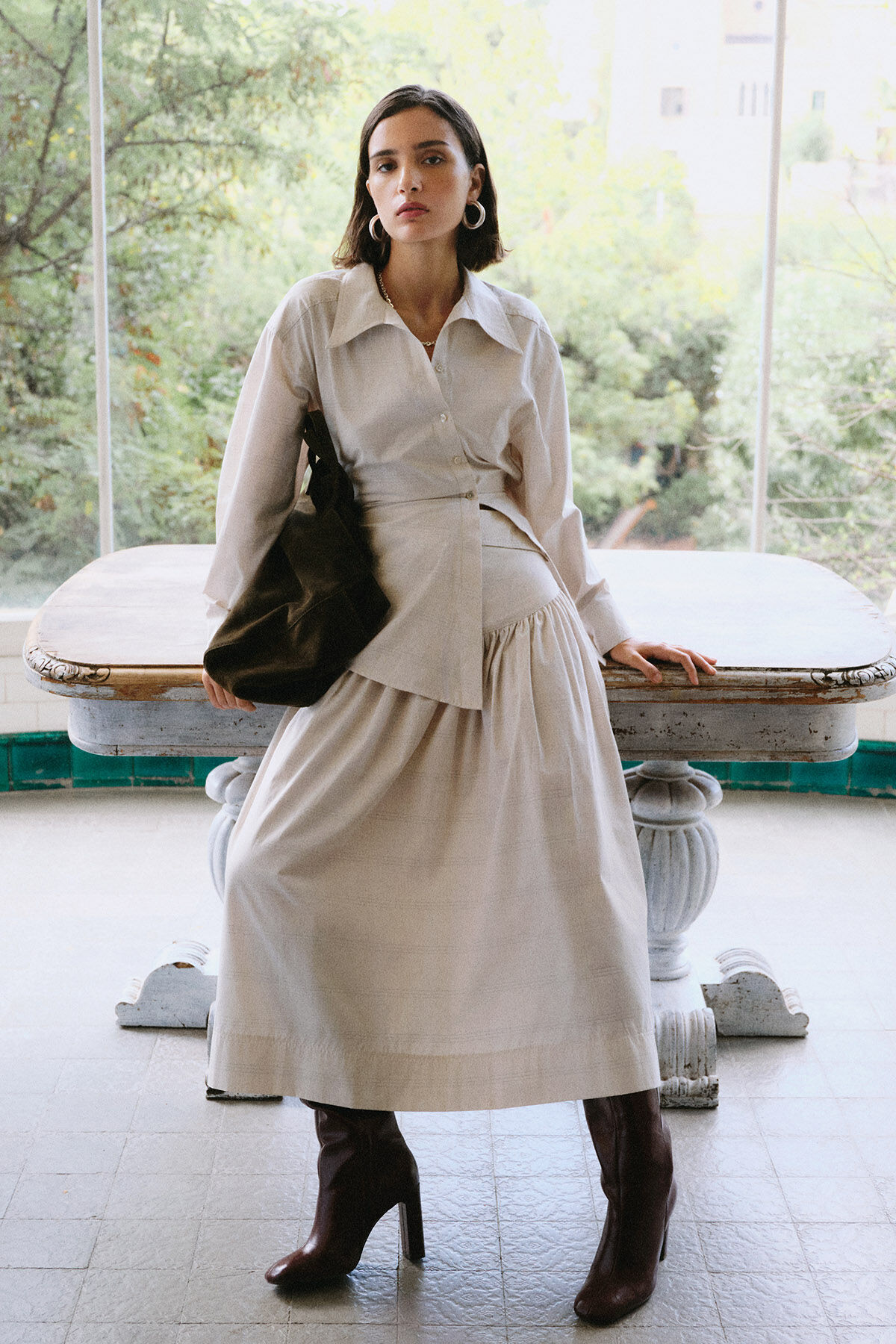 Zarif ve modern bir siluet sunan bu maksi boy etek, bej zemin üzerindeki ekose deseniyle klasik tarzı yeniden yorumluyor. Bel detayları ve basene oturan formu feminen bir görünüm sağlarken, alt kısmındaki büzgü detayı eteğe hacim ve hareket kazandırır. Yumuşak dokulu pamuk kumaşı sayesinde gün boyu konforlu bir kullanım sunar. Günlük kombinlerden özel davetlere kadar stil sahibi bir seçenek olarak öne çıkar.