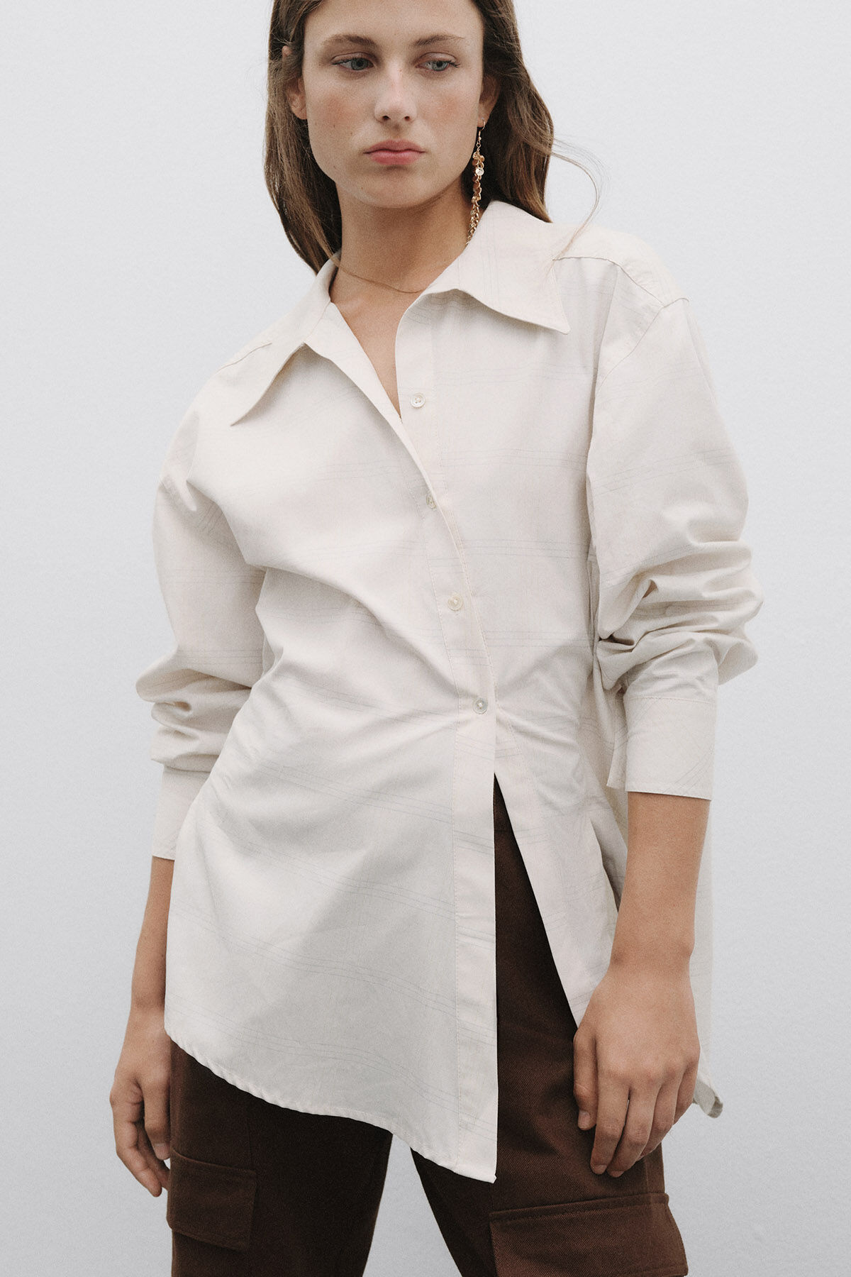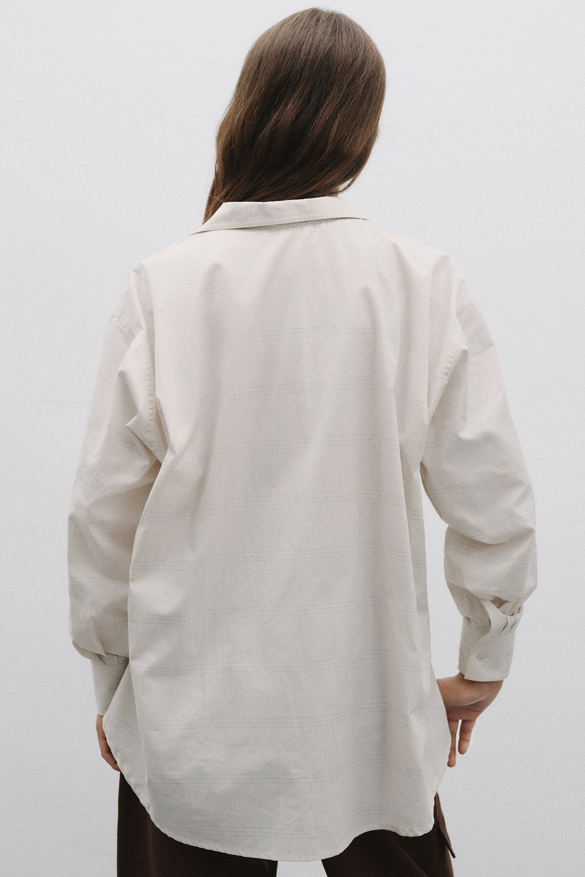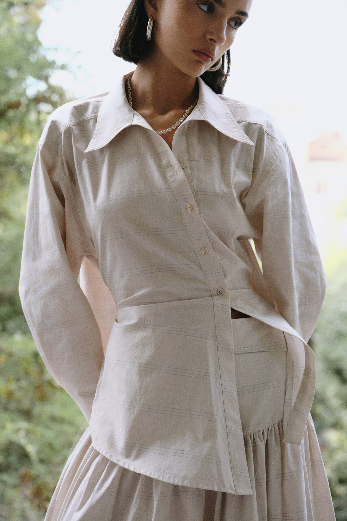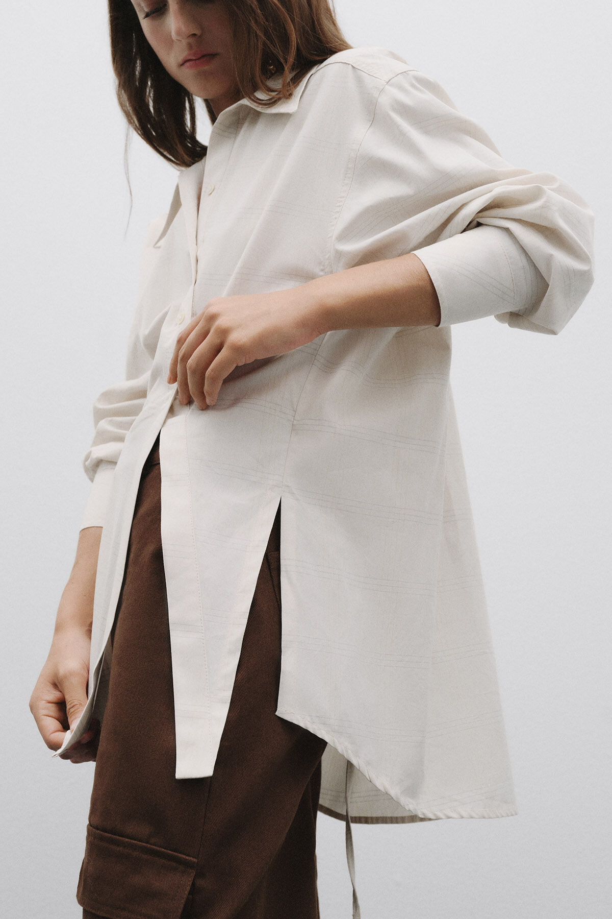 Gelince Haber VerBej rengi ekoseli pamuk kumaştan önden asimetrik düğme kapamalı geniş kesim yanları yırtmaçlı gömlek.