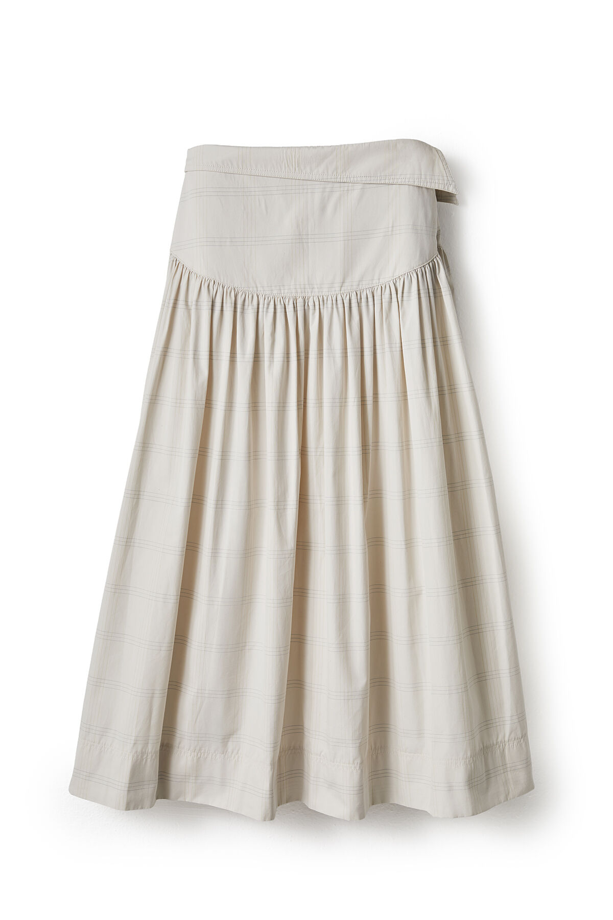 Notify me when its in stockBeige plaid cotton maxi skirt with waist detailing, fitted hips, and gathered hem