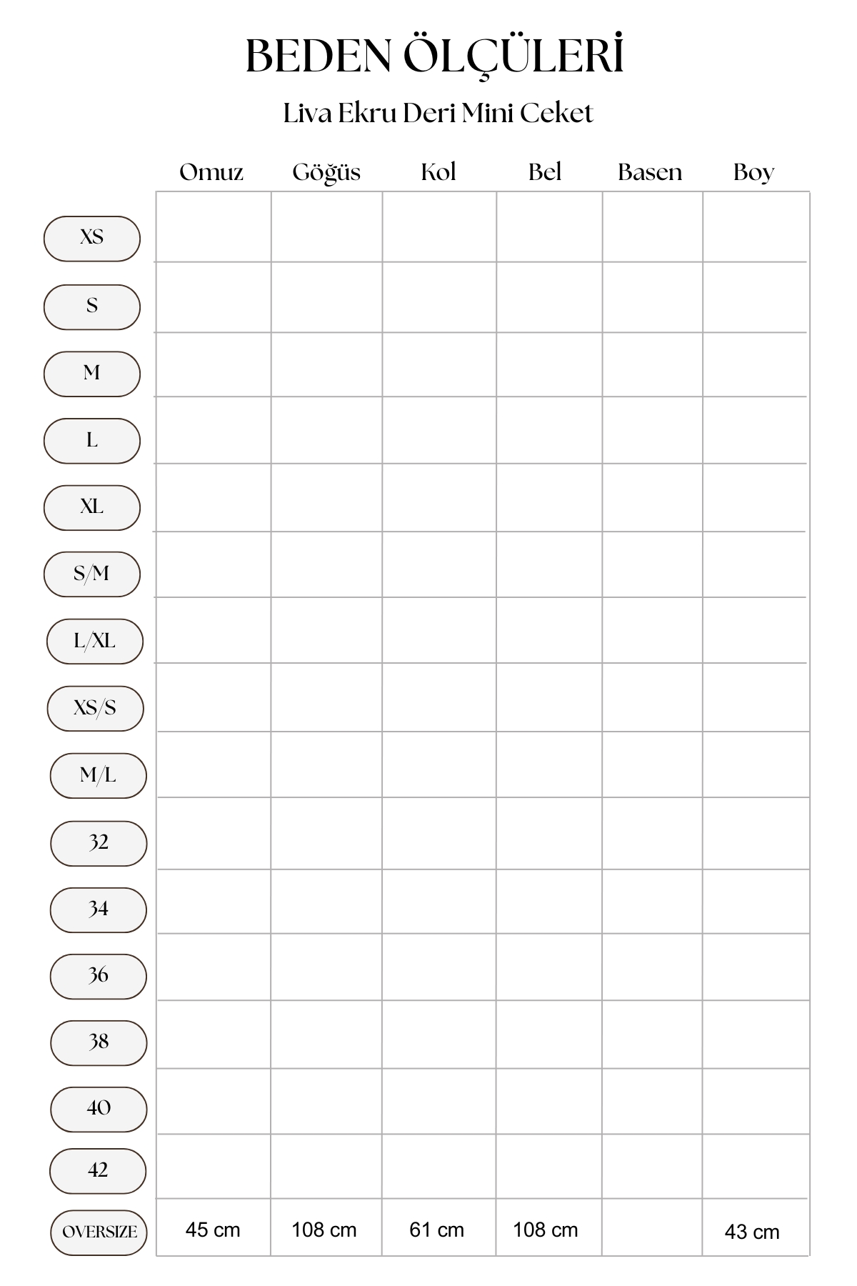 Ekru renkli suni deri mini ceket, şıklığı ve modern tasarımıyla öne çıkan iddialı bir parça. Önden kaplama düğme detayları ve cepli yapısıyla hem fonksiyonel hem de zarif bir görünüm sunan bu ceket, gömlek yakası ve kemerli kollarıyla stilinize sofistike bir dokunuş katıyor. Apolet detayları, cekete dinamik ve güçlü bir hava kazandırırken, suni deri materyal ise şıklığı ve dayanıklılığı bir arada sunuyor. Hem günlük kullanımlarda hem de şık davetlerde rahatlıkla tercih edebileceğiniz bu mini ceket, modern ve elegan tarzınızı tamamlayacak mükemmel bir parça.