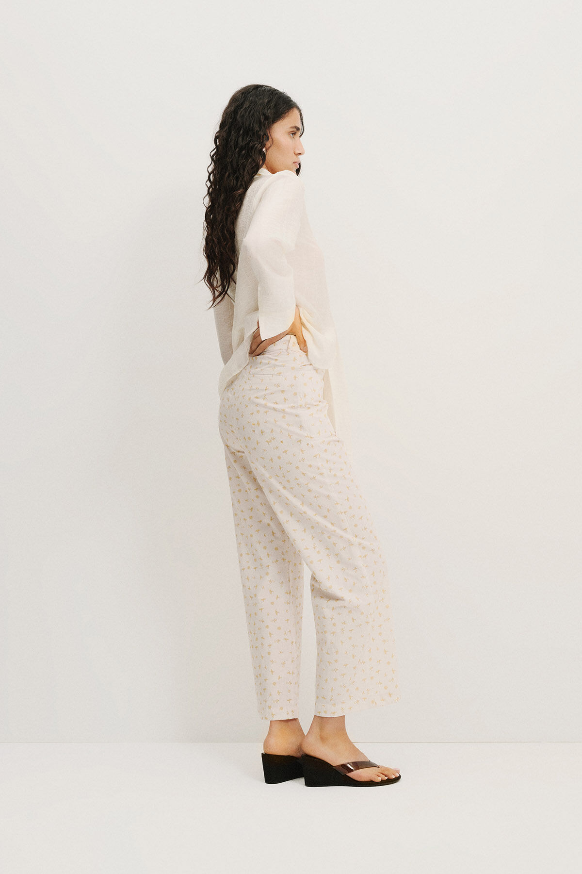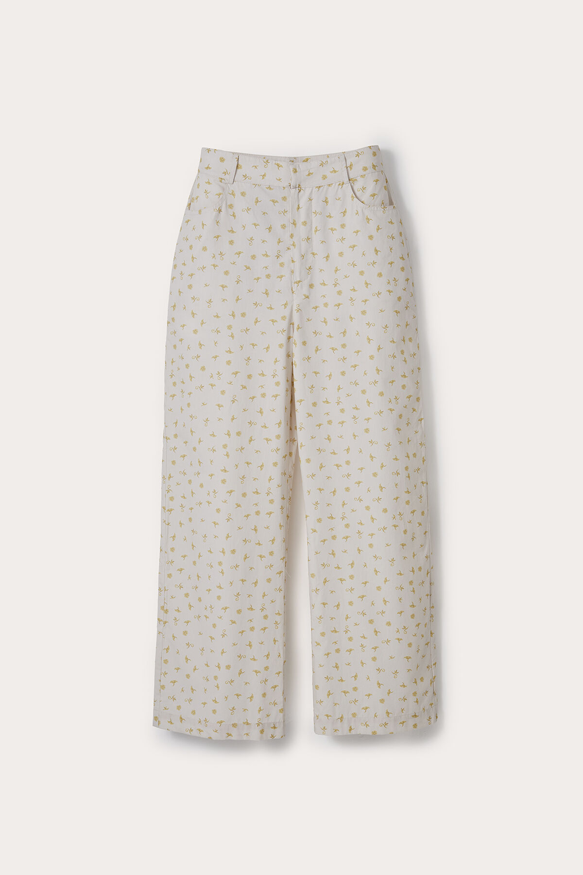Gelince Haber VerKrem sarı çiçek çıtır desenli beli kemer köprülü cepli geniş kesim pamuk kumaştan pantolon.