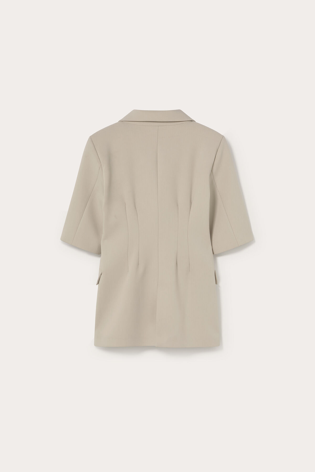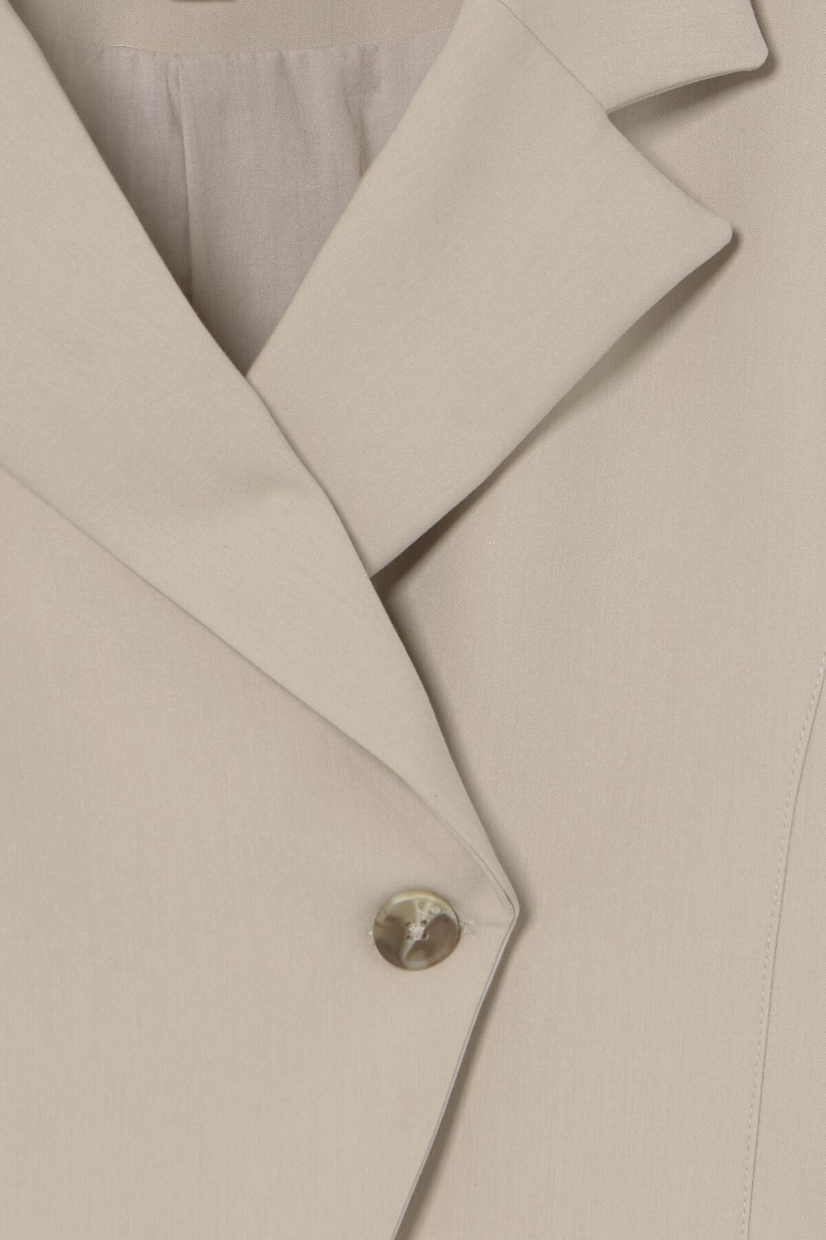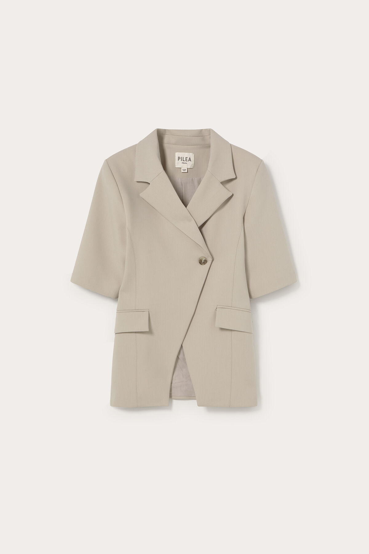 Gelince Haber VerBej rengi klapa yaka önden tek düğmeli asimetrik kesim sırtı pensli yırtmaçlı kısa kollu cep kapaklı pamuk vual astarlı, likralı viskon polyester karışımlı kumaştan fit kesim ceket.