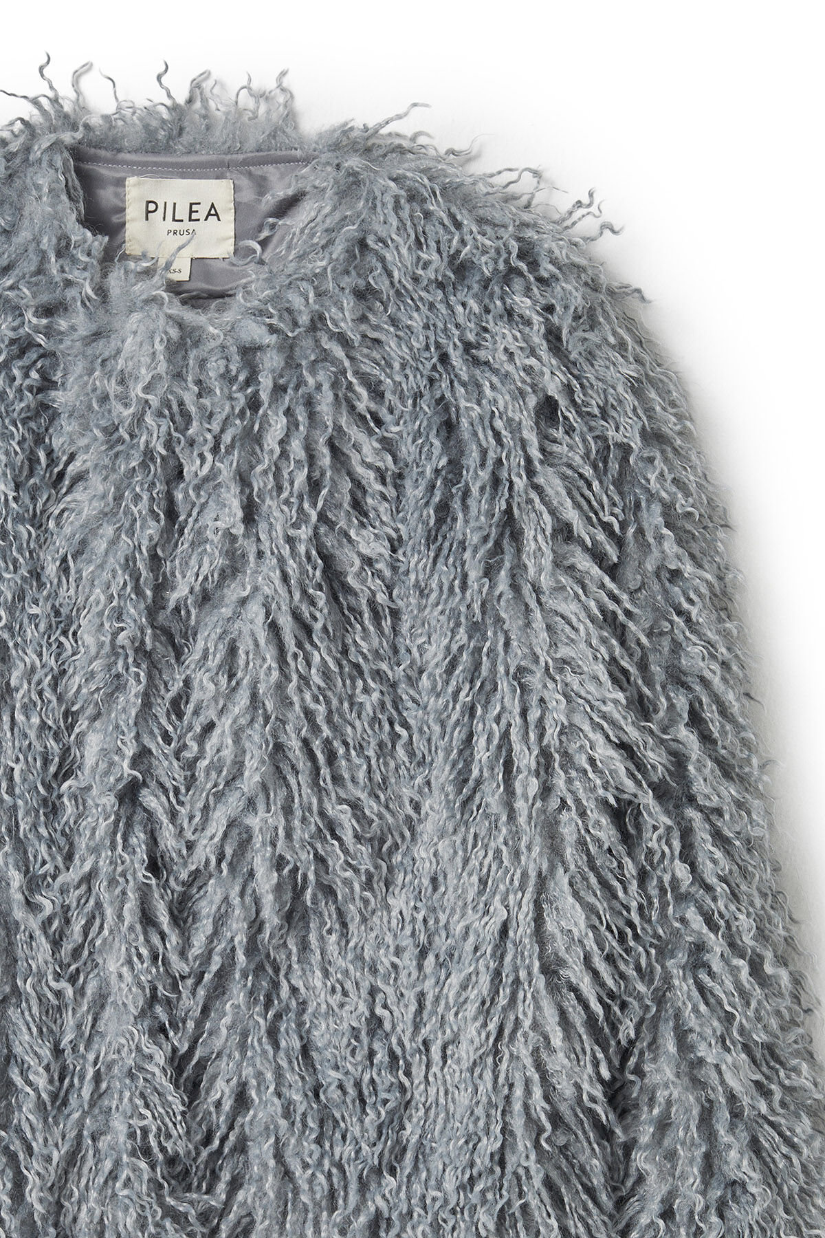 Gelince Haber VerMavi uzun kollu önden agraf kapamalı içi astarlı kısa suni kürk ceket.