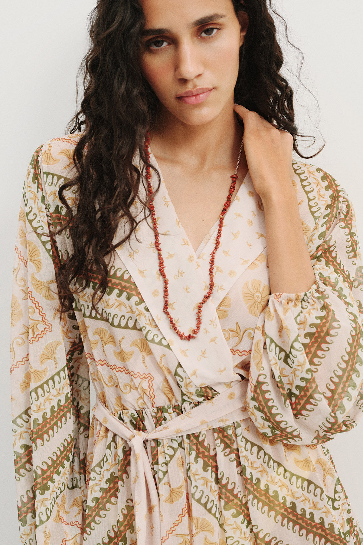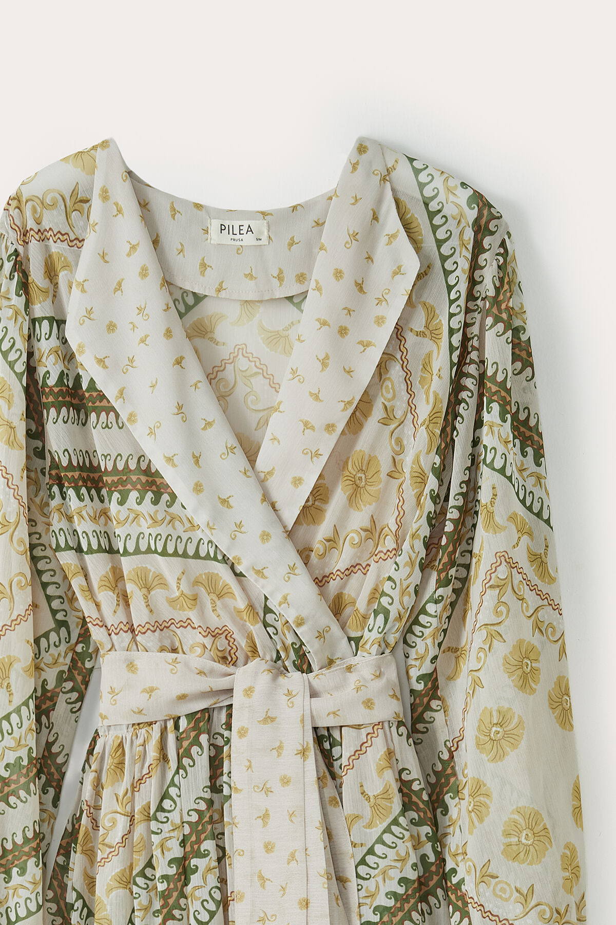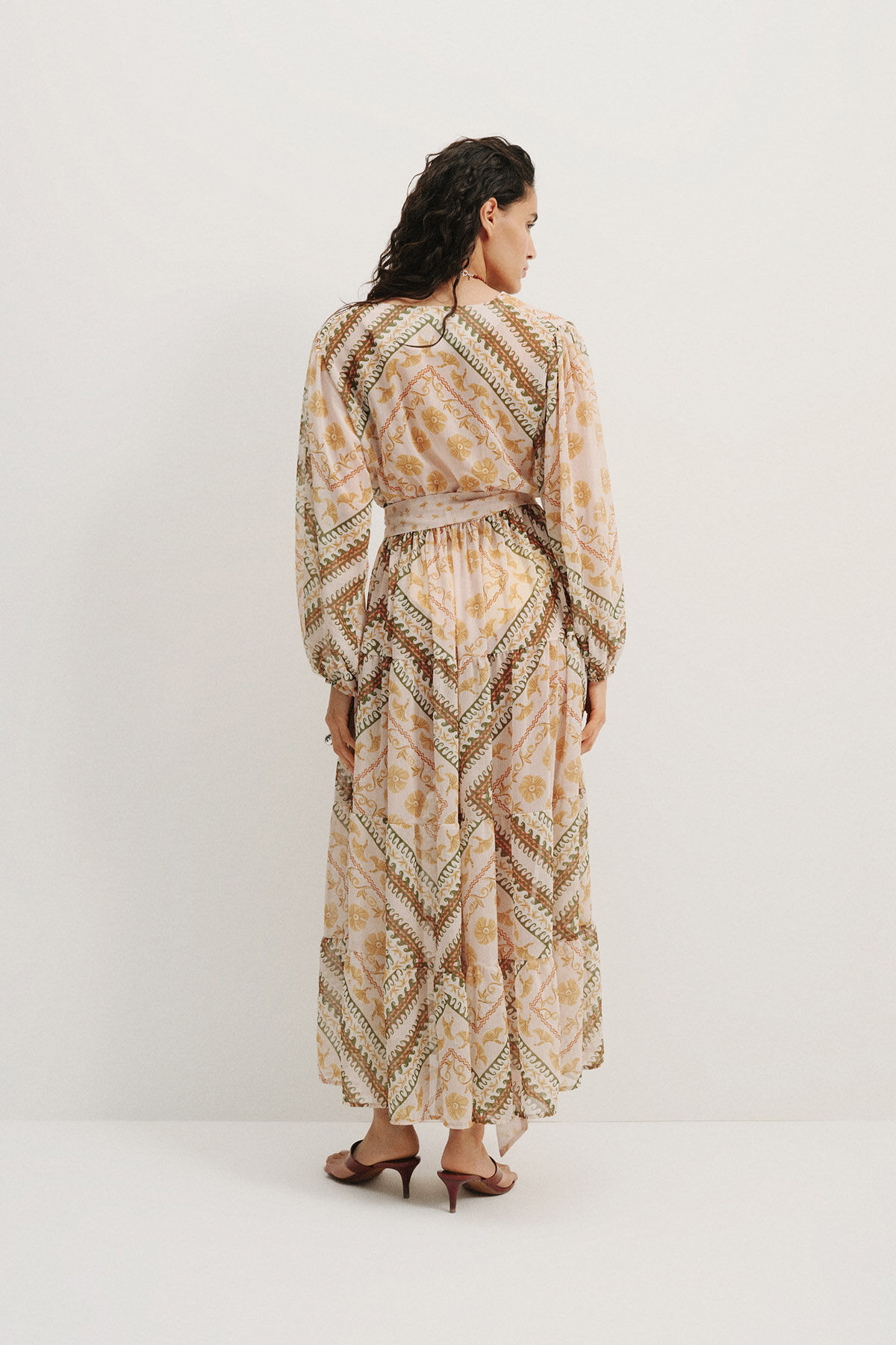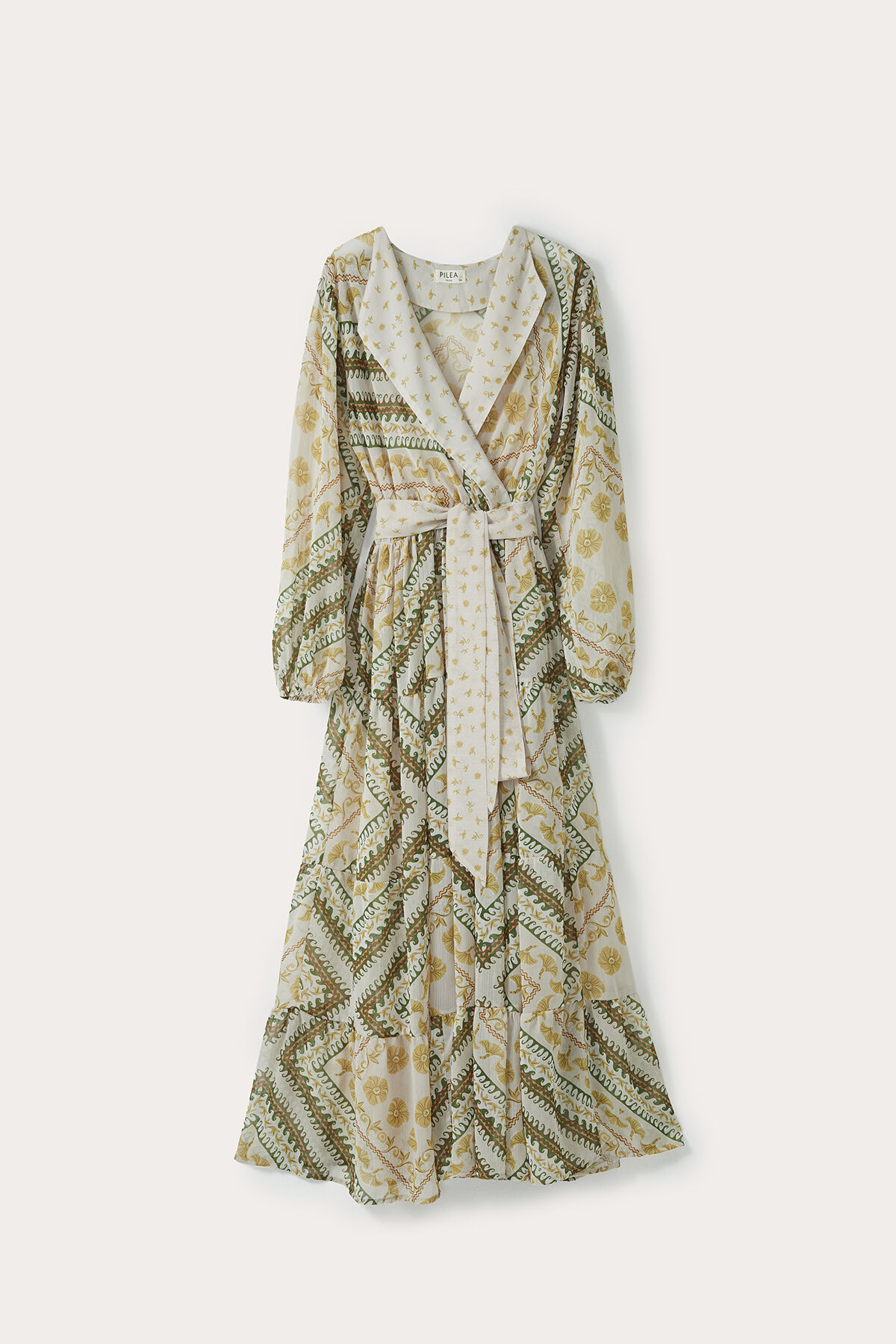Make a bold statement with this vibrant ethnic pattern maxi dress, featuring a wrap-style lapel collar and long sleeves with gathered cuffs for a sophisticated silhouette. The adjustable waist tie flatters the figure, while the tiered chiffon skirt adds movement and feminine charm. Designed with a detachable inner lining for extra comfort, this dress is both breezy and elegant—perfect for daytime outings or special occasions where you want to stand out with effortless grace.