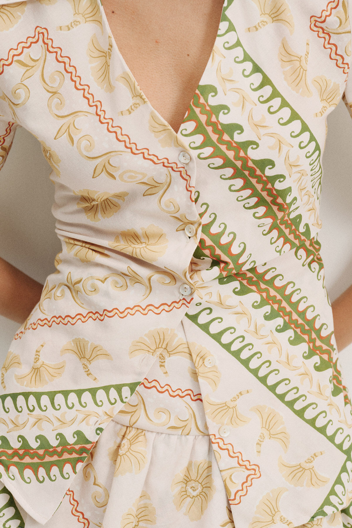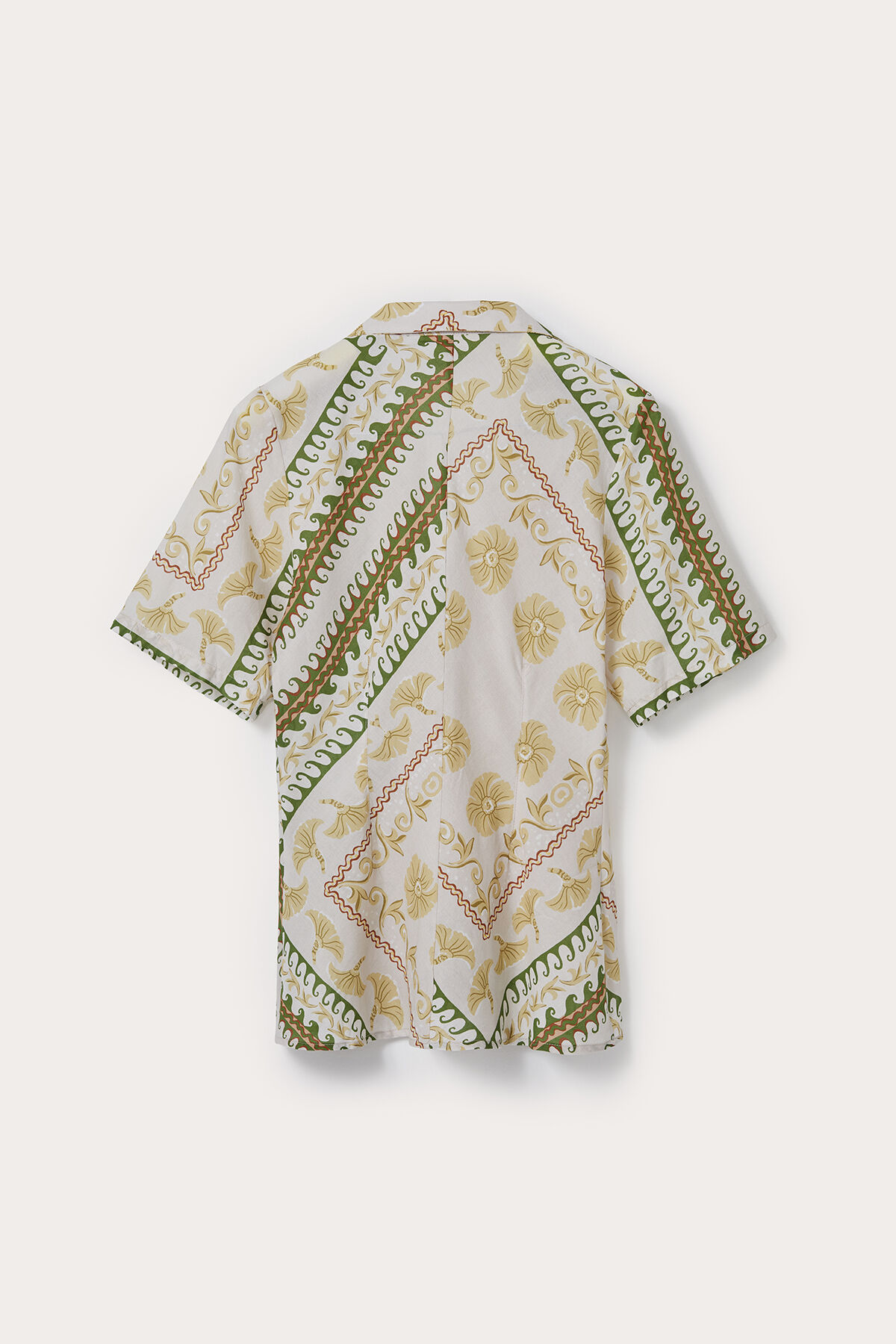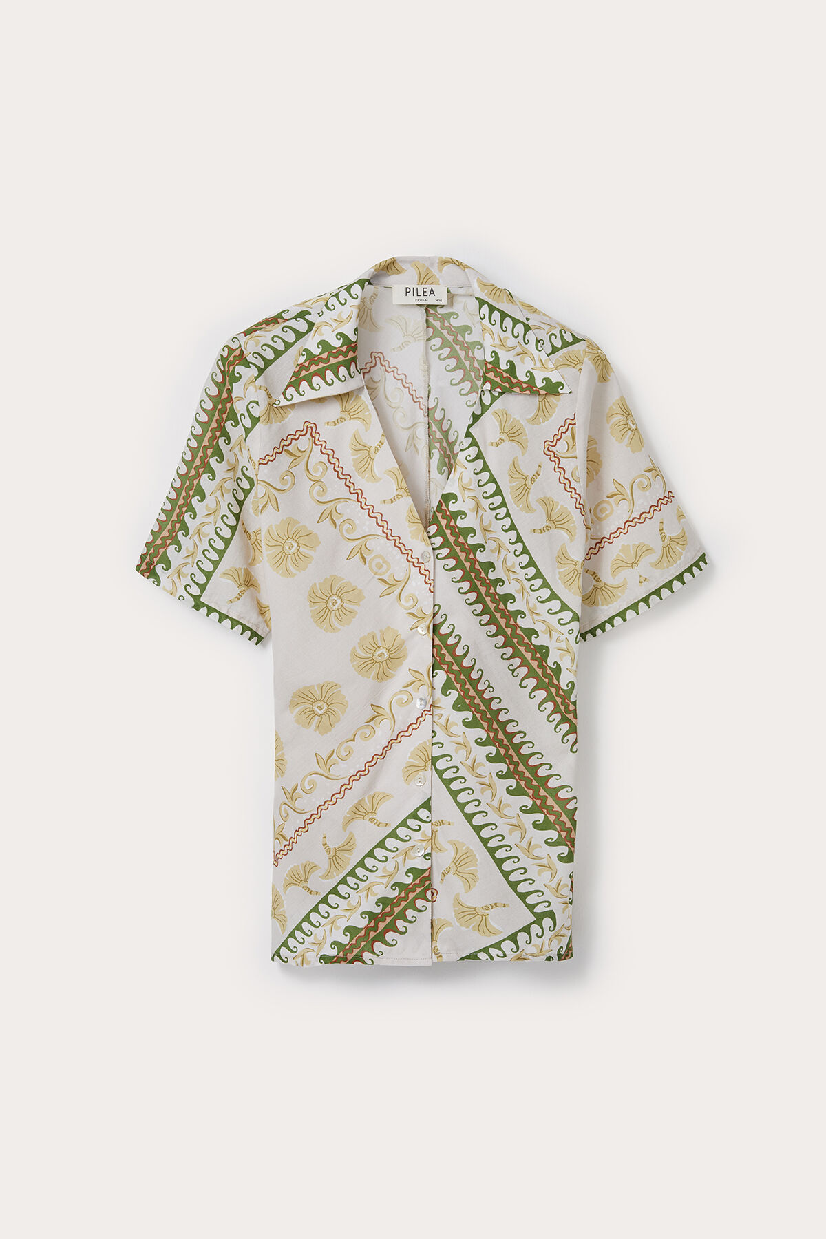 This ethnic-patterned shirt blends style and comfort effortlessly. With its colorful design and V-neck detail, it stands out as a chic and trendy piece. The short sleeves and wide collar provide comfort and ease, perfect for warm weather. The button-front and fit-cut design create a flattering silhouette that fits the body beautifully. Made from 100% cotton, it is lightweight, breathable, and ideal for all-day wear. Perfect for daily wear or special occasions, this shirt adds an ethnic touch to your style.