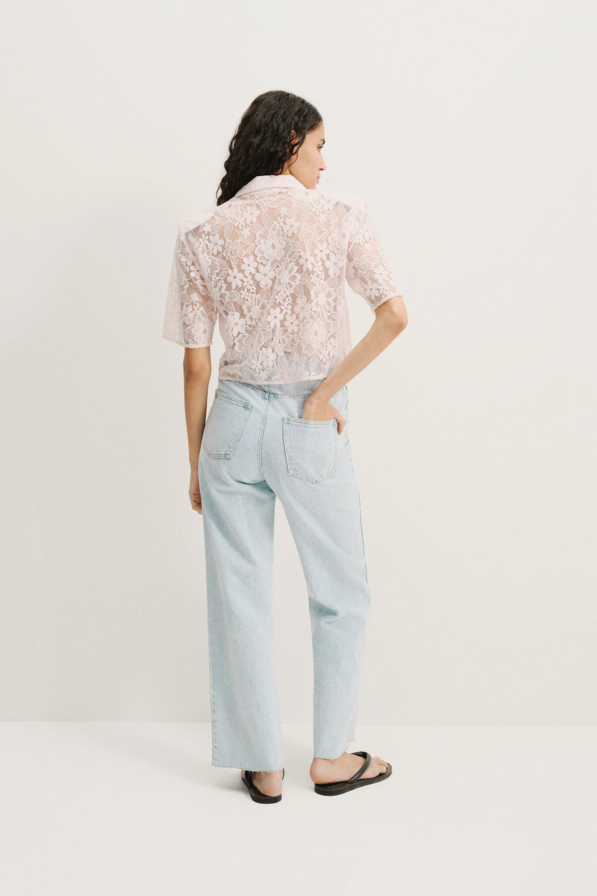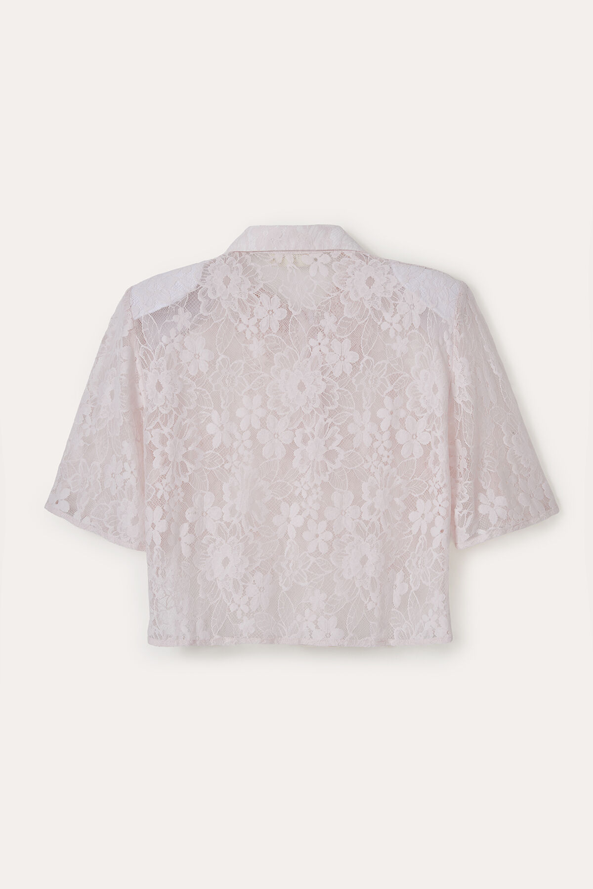 Gelince Haber VerAçık pembe pamuk karışımlı dantel kumaştan kısa kollu geniş yakalı önden yarım düğmeli gömlek bluz.