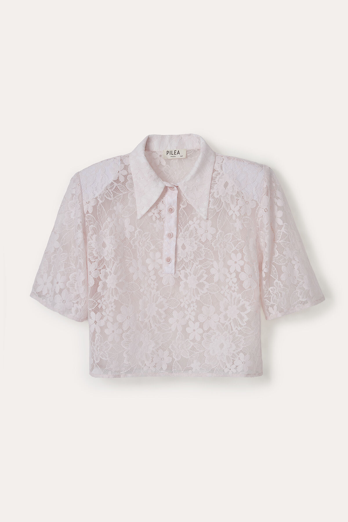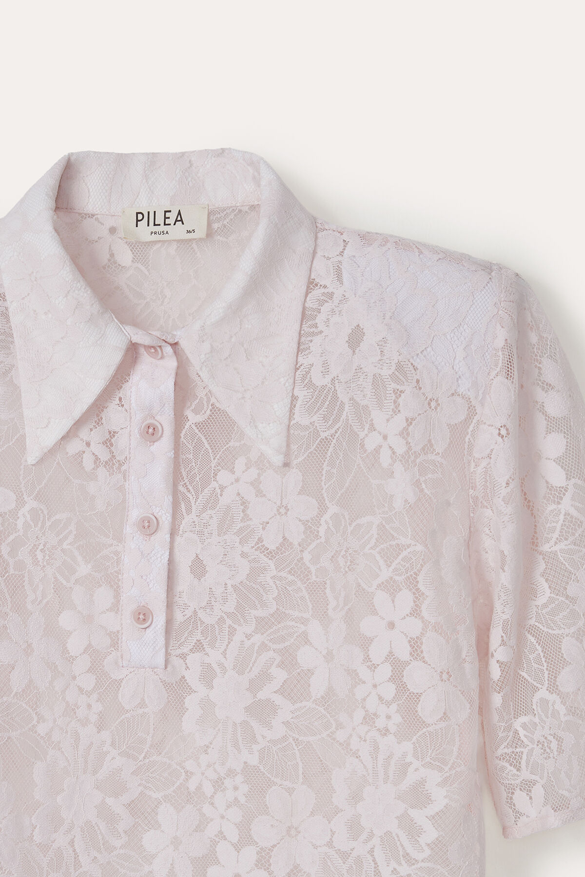Delicate and romantic, this light pink shirt blouse is crafted from a breathable cotton blend lace fabric. The short sleeves and wide collar create an effortlessly feminine look, while the half button-front adds a touch of classic charm. Perfect for both everyday styling and special occasions, this lightweight blouse brings together elegance and comfort — an essential piece for chic summer outfits.