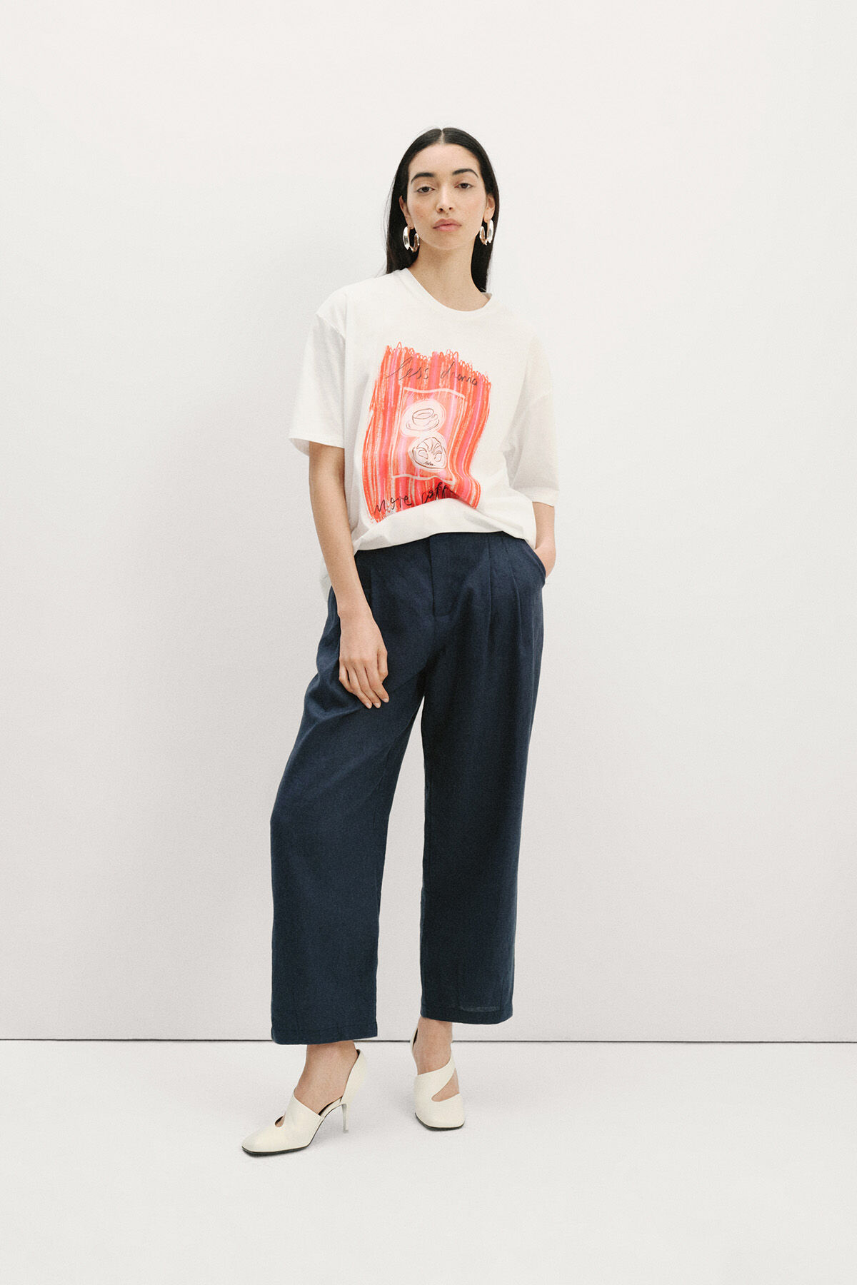 Tarz sahibi ve rahat bir görünüm sunan bu beyaz tişört, %100 pamuk kumaşıyla gün boyu konfor sağlar. Bisiklet yaka ve kısa kollu tasarımıyla sıcak havalarda ferahlık sunarken, ön kısmındaki dikkat çekici dijital baskı modern bir dokunuş katar. Geniş kesimi ile özgürce hareket etme imkânı sunan bu tişört, günlük stilin vazgeçilmez parçalarından biri olmaya aday.