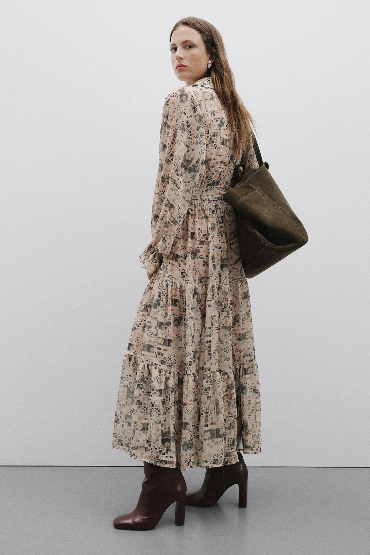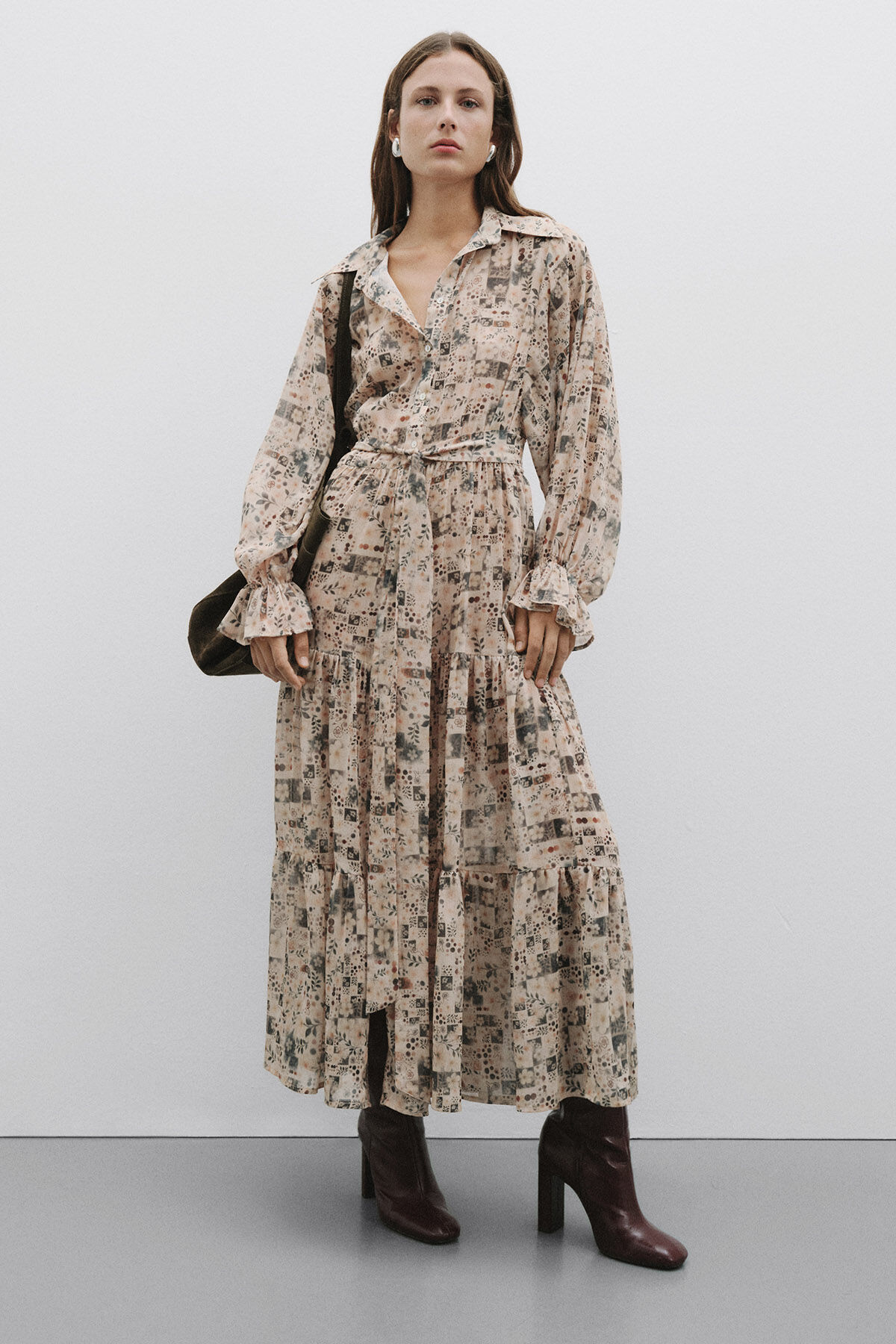 Gelince Haber VerPastel renklerde çiçek desenli geniş kollu manşetleri büzgülü geniş gömlek yaka bele oturan yaka bağlama detaylı önden düğmeli kloş katlı portatif pamuk starlı şifon kumaştan maksi boy elbise.