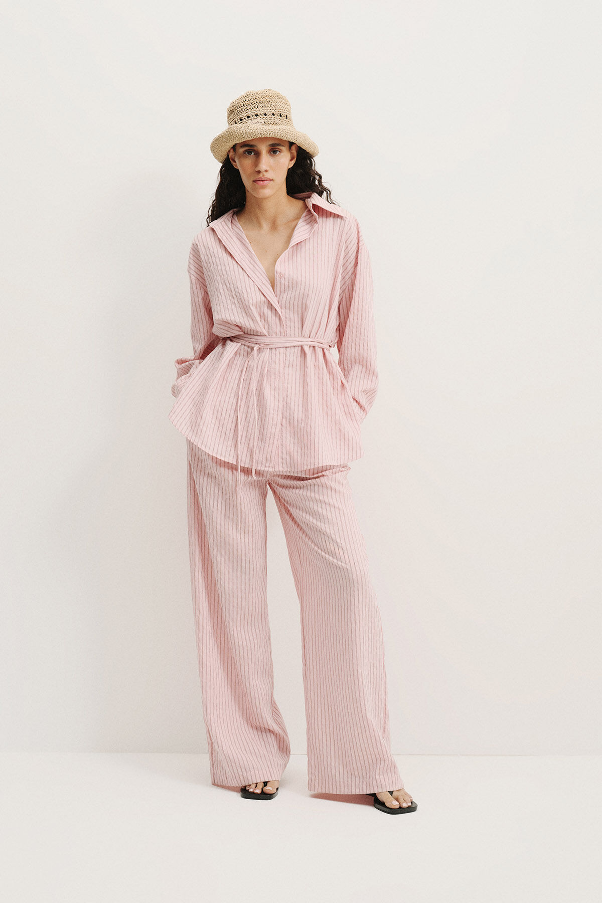 Rahatlığı ve şıklığı bir arada sunan bu pembe bordo çizgili gömlek, geniş yakası ve bol kesimiyle gün boyu konfor sağlarken, modern ve zarif bir görünüm sunar. Uzun kollu tasarımı her mevsim kullanım için uygundur. Bel kısmındaki ip bağlama detayı, vücut formunu zarifçe vurgularken, modal karışımlı kumaşı yumuşak dokusu ve nefes alabilir yapısıyla öne çıkar. Hem günlük kombinlerde hem de ofis stilinde şık bir tamamlayıcı olarak tercih edilebilir.