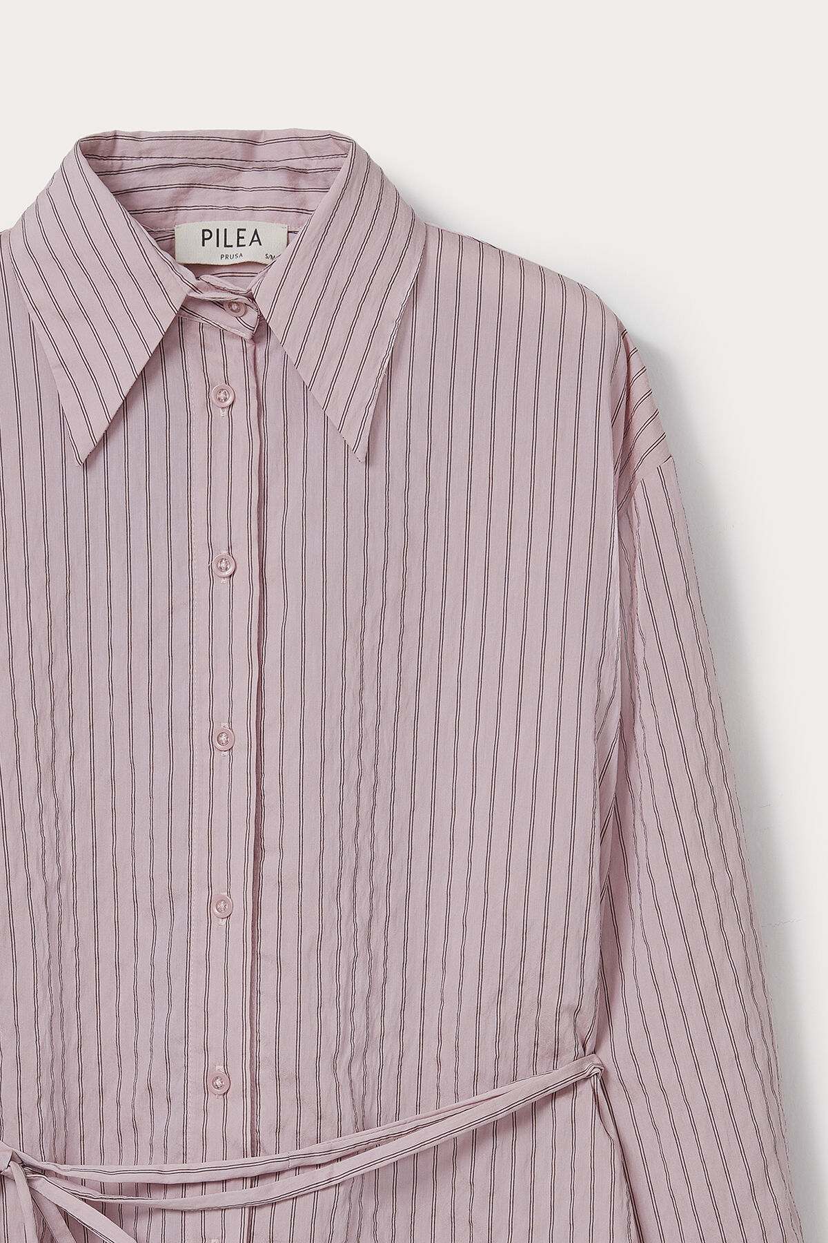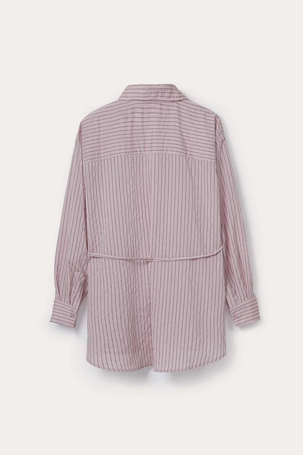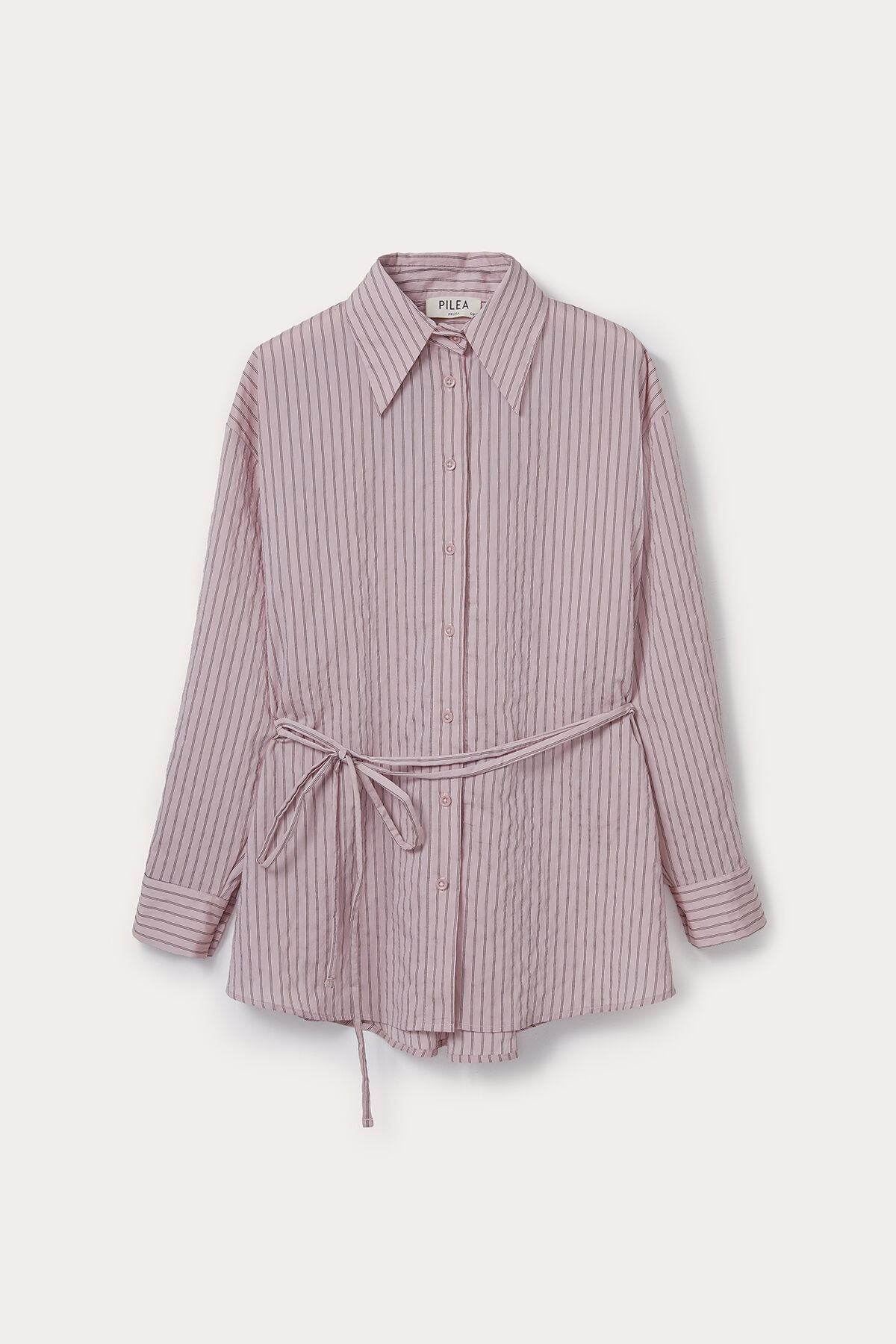 Gelince Haber VerPembe bordo çizgili geniş yakalı uzun kollu geniş kesim beli ip bağlamalı modal karışımlı gömlek.