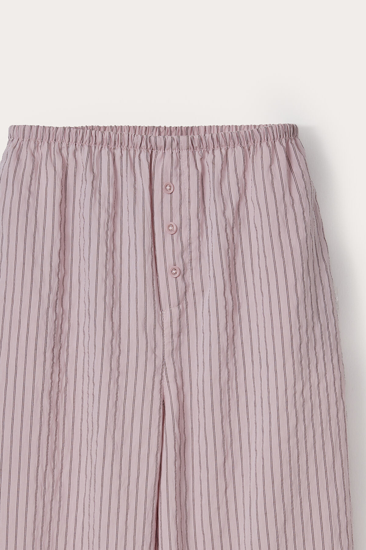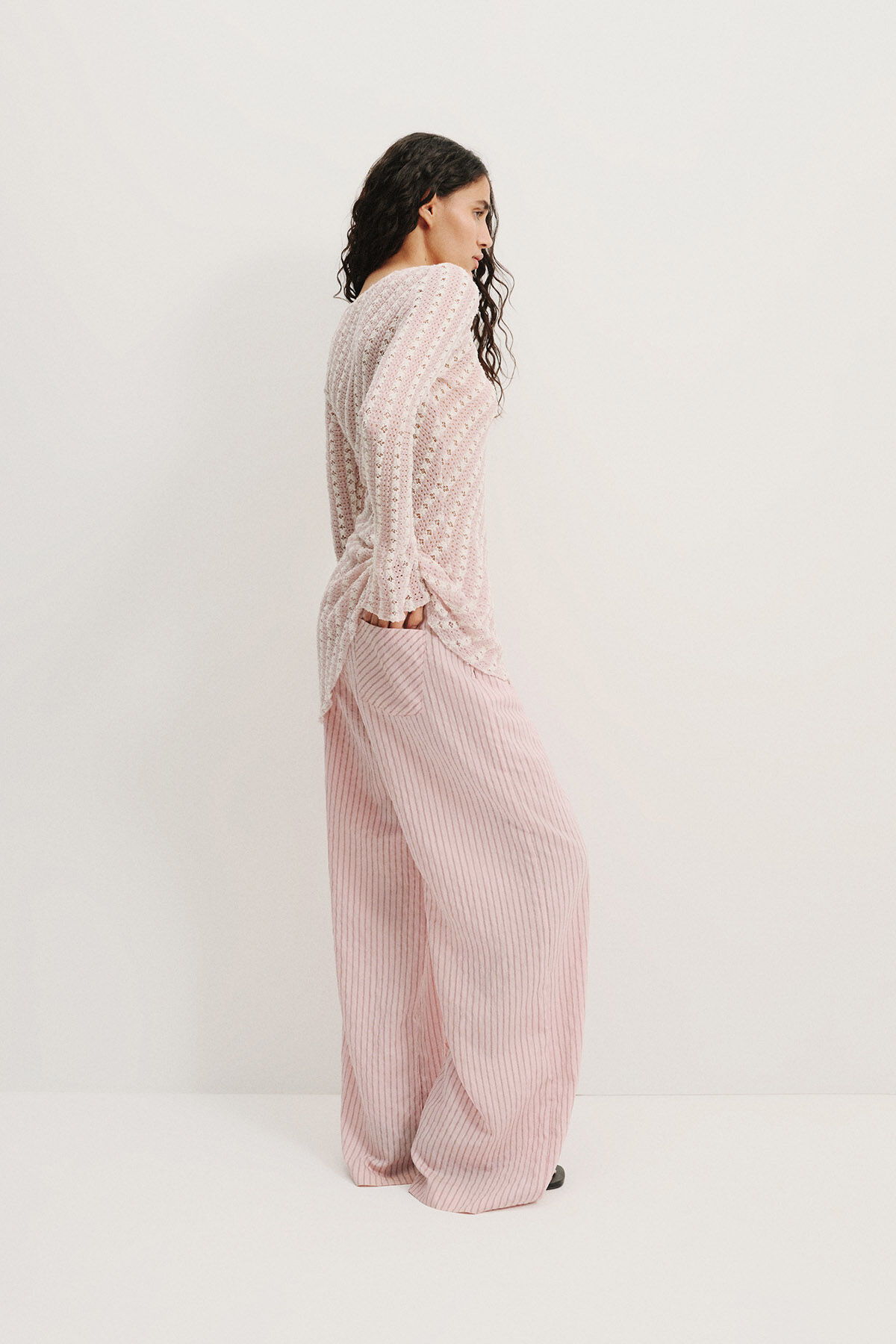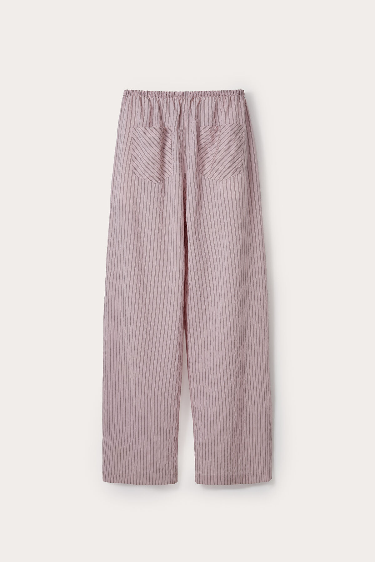 Gelince Haber VerAçık pembe çizgili beli lastikli önden düğmeli geniş kesim dökümlü modal kumaştan pantolon.