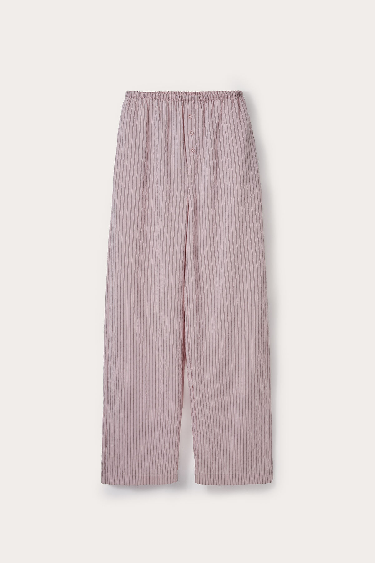 Combining comfort and elegance, these light pink striped pants offer a flowing silhouette for all-day ease. The elastic waistband ensures a perfect fit and easy wear, while the button-front detail adds a stylish touch. Made from 100% modal fabric, this wide-leg pant drapes beautifully and is a go-to piece for casual chic looks.