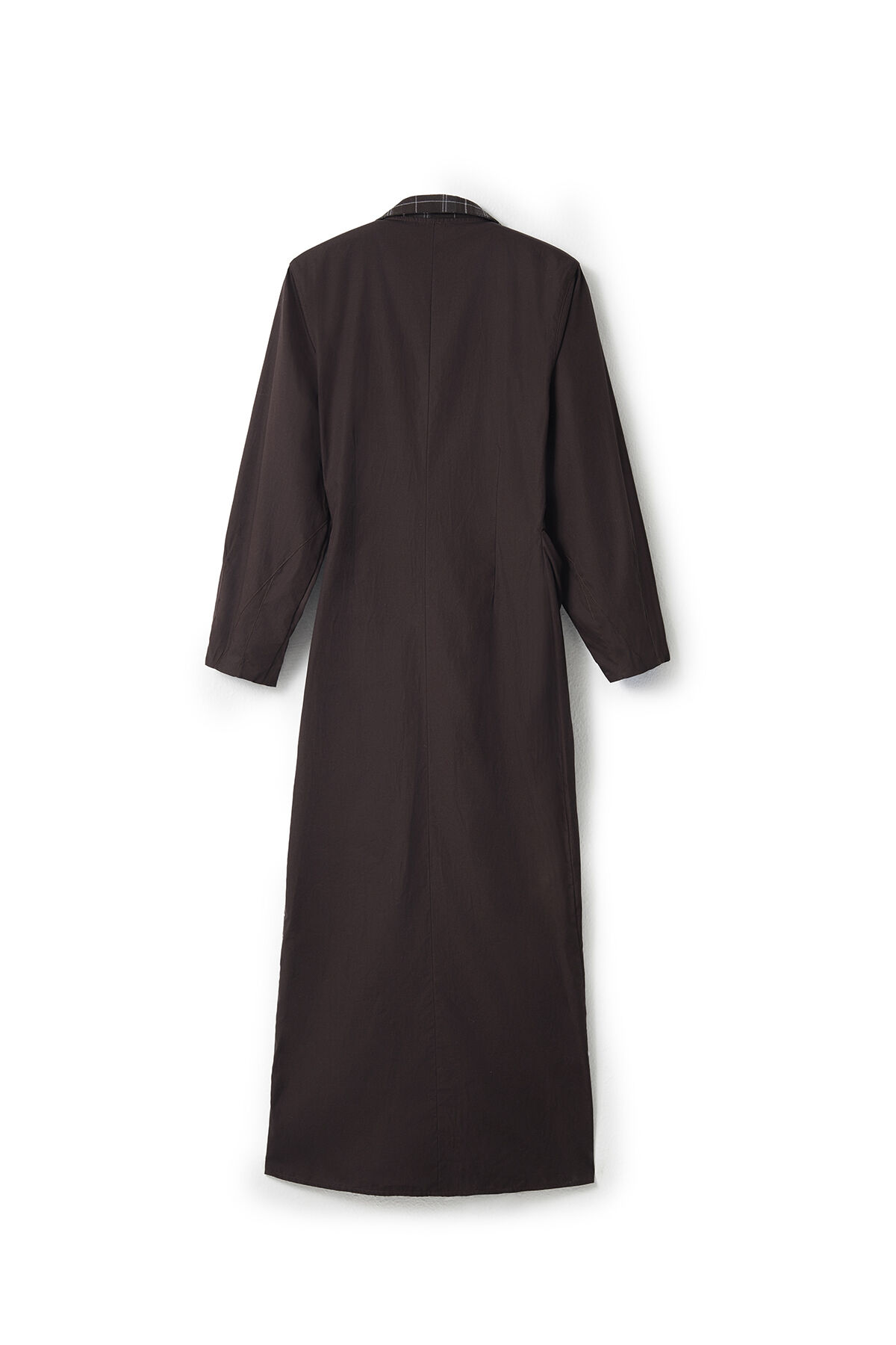 Notify me when its in stockMaxi dress with dark brown cotton fabric and plaid cotton blend fabric, wrap-style gathered front, shirt collar, long sleeves