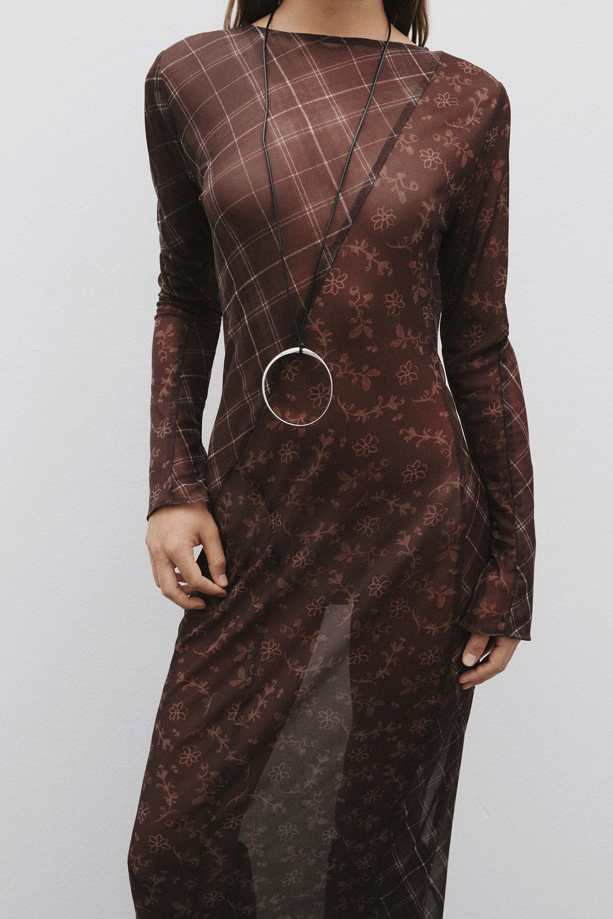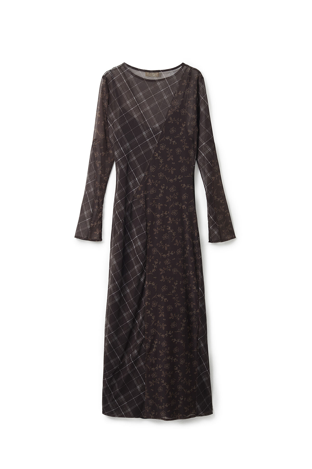 Notify me when its in stockMaxi dress in brown plaid and floral print combination, asymmetrical seam detail, crew neck, long sleeves, fitted cut with portable cotton-lined mesh fabric