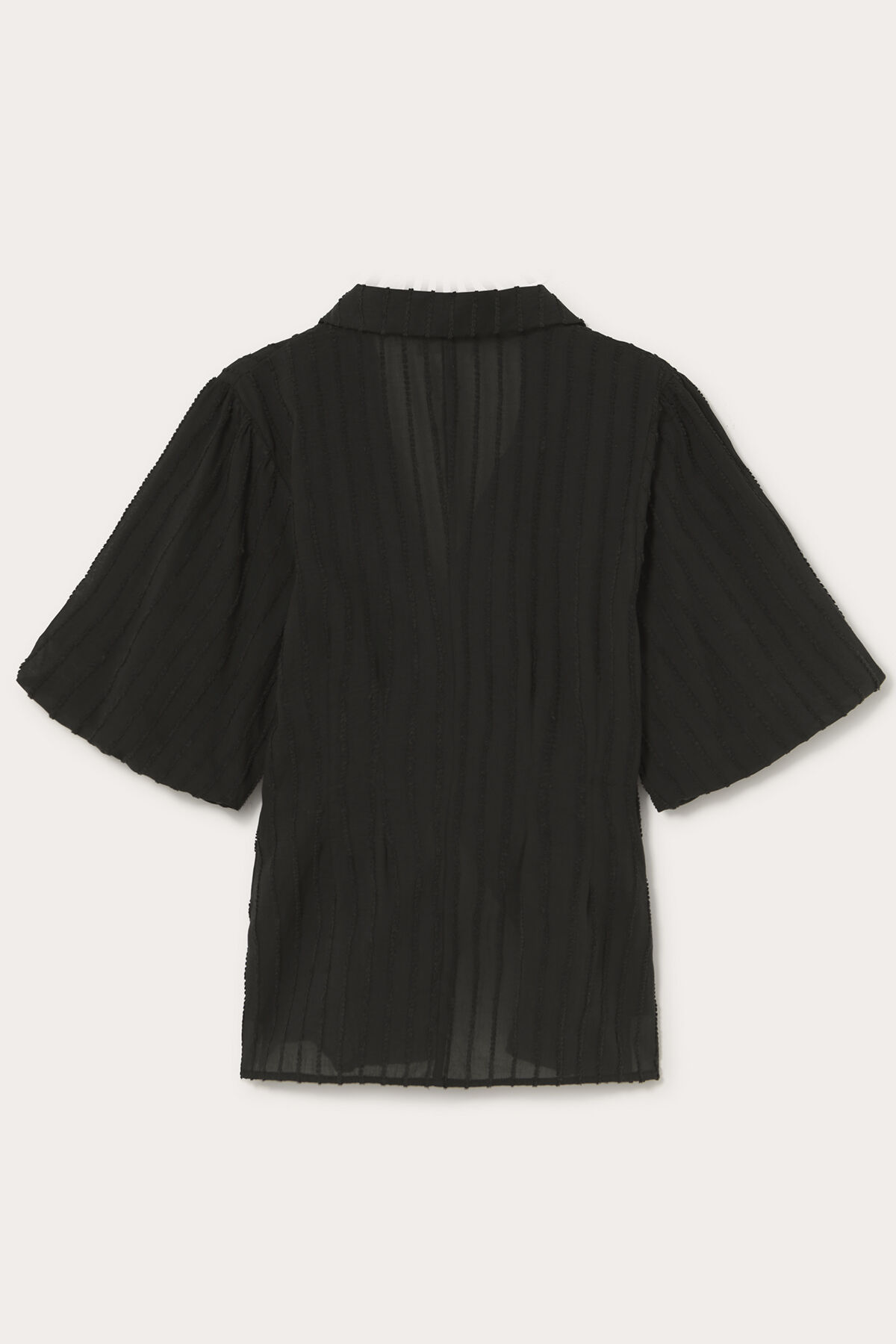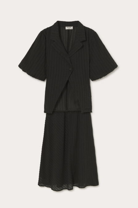 Gelince Haber VerSiyah ceket yaka önden tek düğmeli kısa balon kollu fit kesim kendinden vual astarlı pamuk dokulu pamuk kumaştan gömlek.
